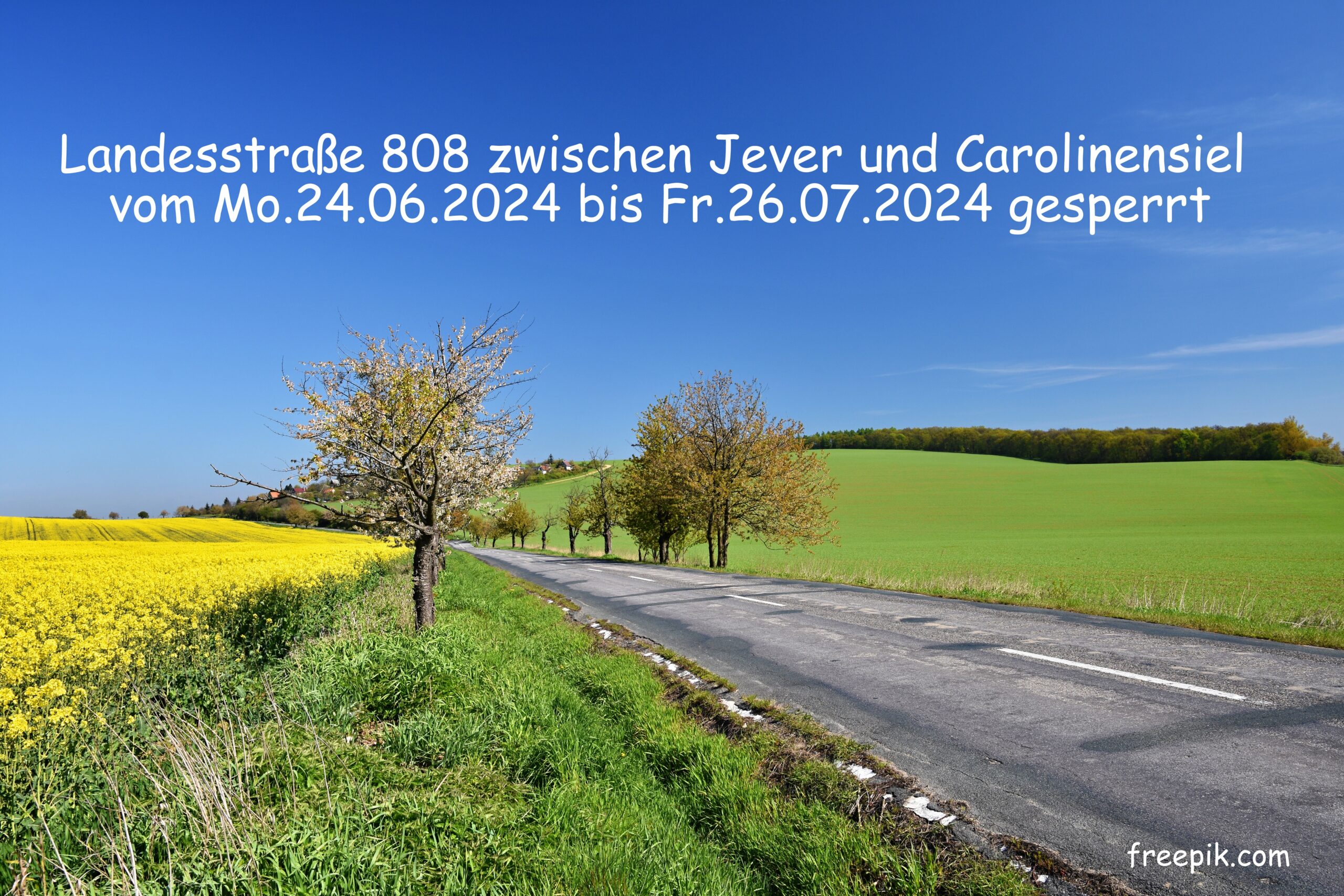 Asphalt road near a field with beautiful rapeseed flowers (Brass