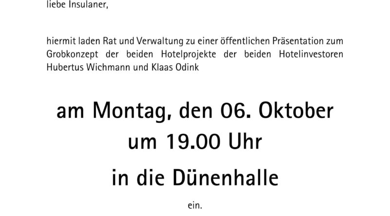 Read more03.10.2025 Öffentliche Präsentation Hotelprojekte an der Oberen Strandpromenade – Montag, den 06.10.2025 – 19.00 Uhr Dünenhalle
