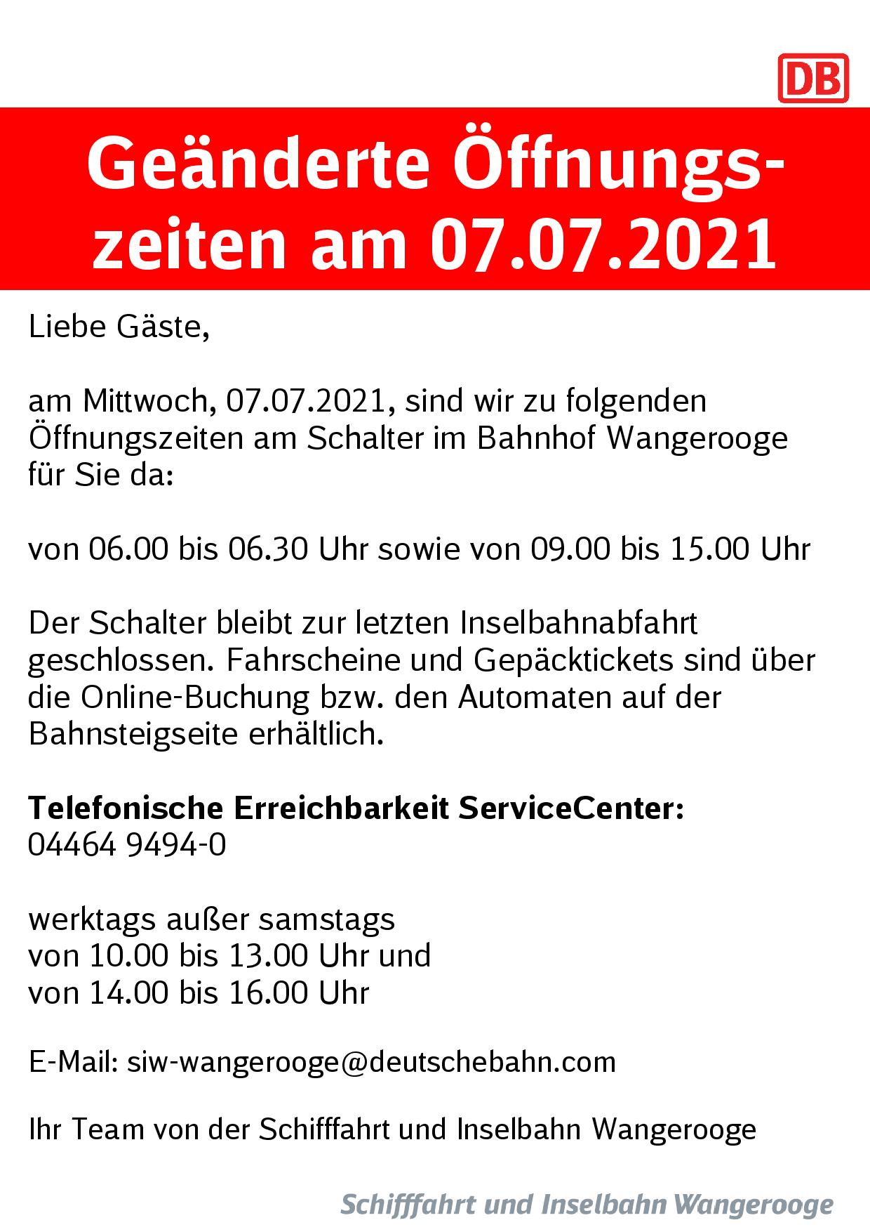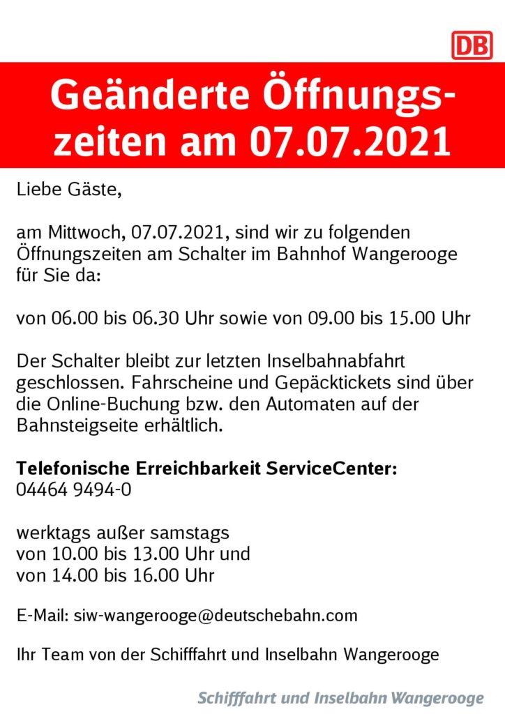 DB/SIW 07.07.2021 Öffnungszeiten Bahnhof Wangerooge am 07.07.2021