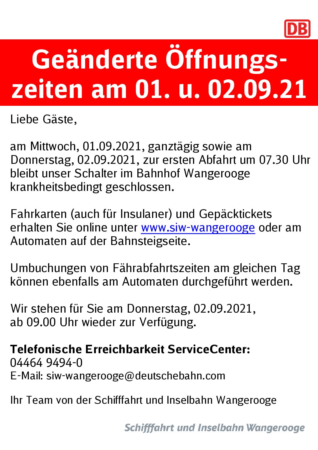 Aktuelles Leute 01.09.2021 DB/SIW Geänderte Öffnungszeiten am 01. + 02.09.21 1. September 2021 peter Post Views: 363