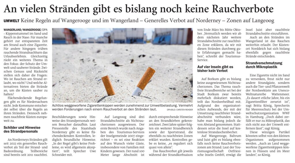 Jeversches Wochenblatt Leute Politik See 02.04.2026 Jeversches Wochenblatt – An vielen Stränden gibt es bislang noch keine Rauchverbote 1. April 20261. April 2026 peter Post Views: 10