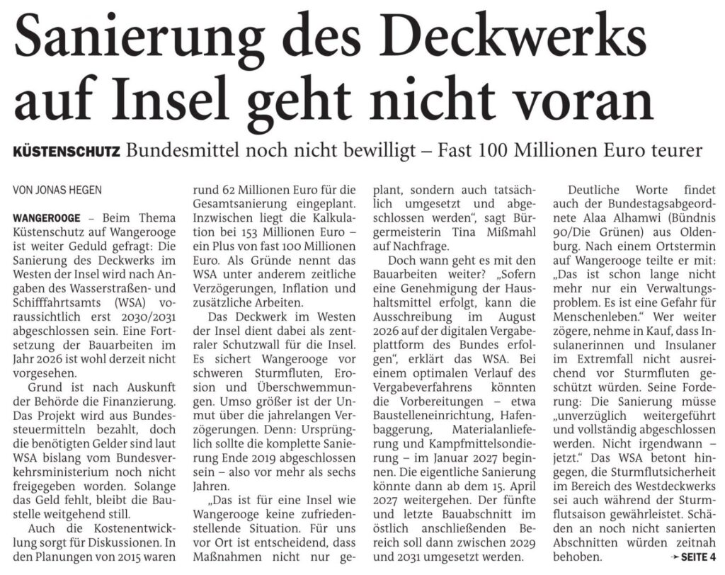 Jeversches Wochenblatt Leute See 03.03.2026 Jeversches Wochenblatt – Sanierung des Deckwerks auf Insel geht nicht voran 2. März 20262. März 2026 peter Post Views: 4