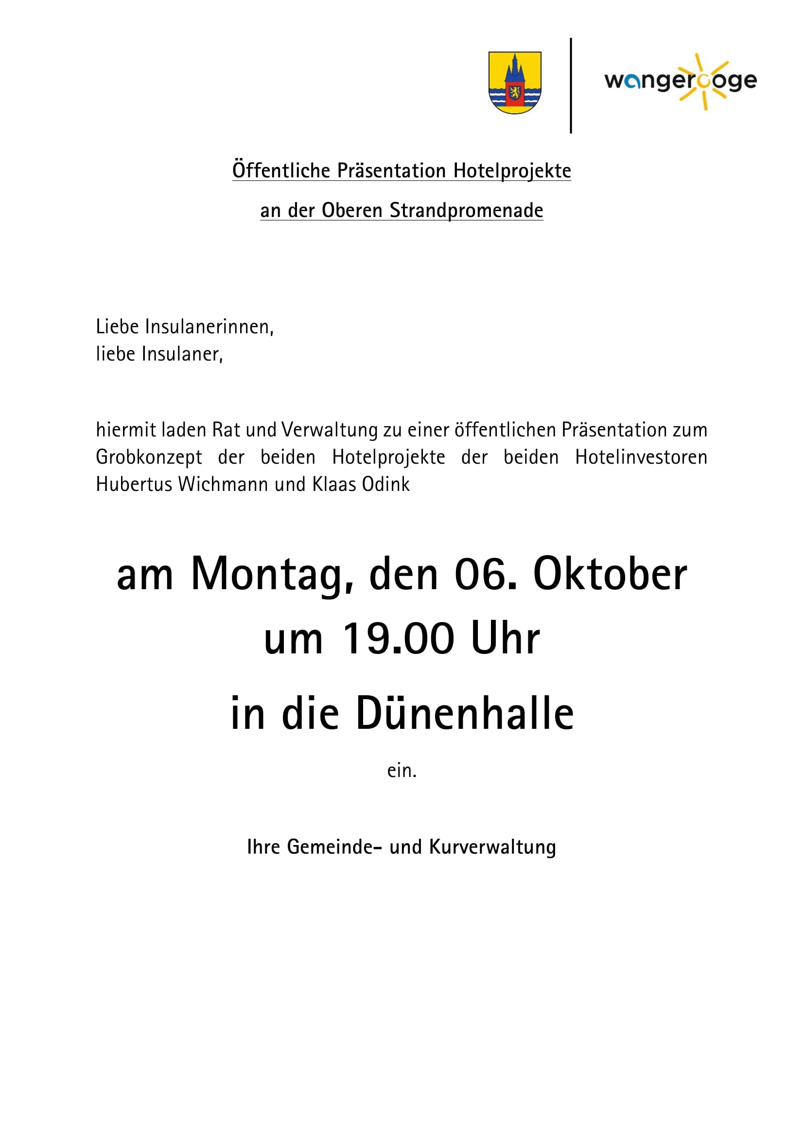 03.10.2025 Öffentliche Präsentation Hotelprojekte an der Oberen Strandpromenade – Montag, den 06.10.2025 – 19.00 Uhr Dünenhalle