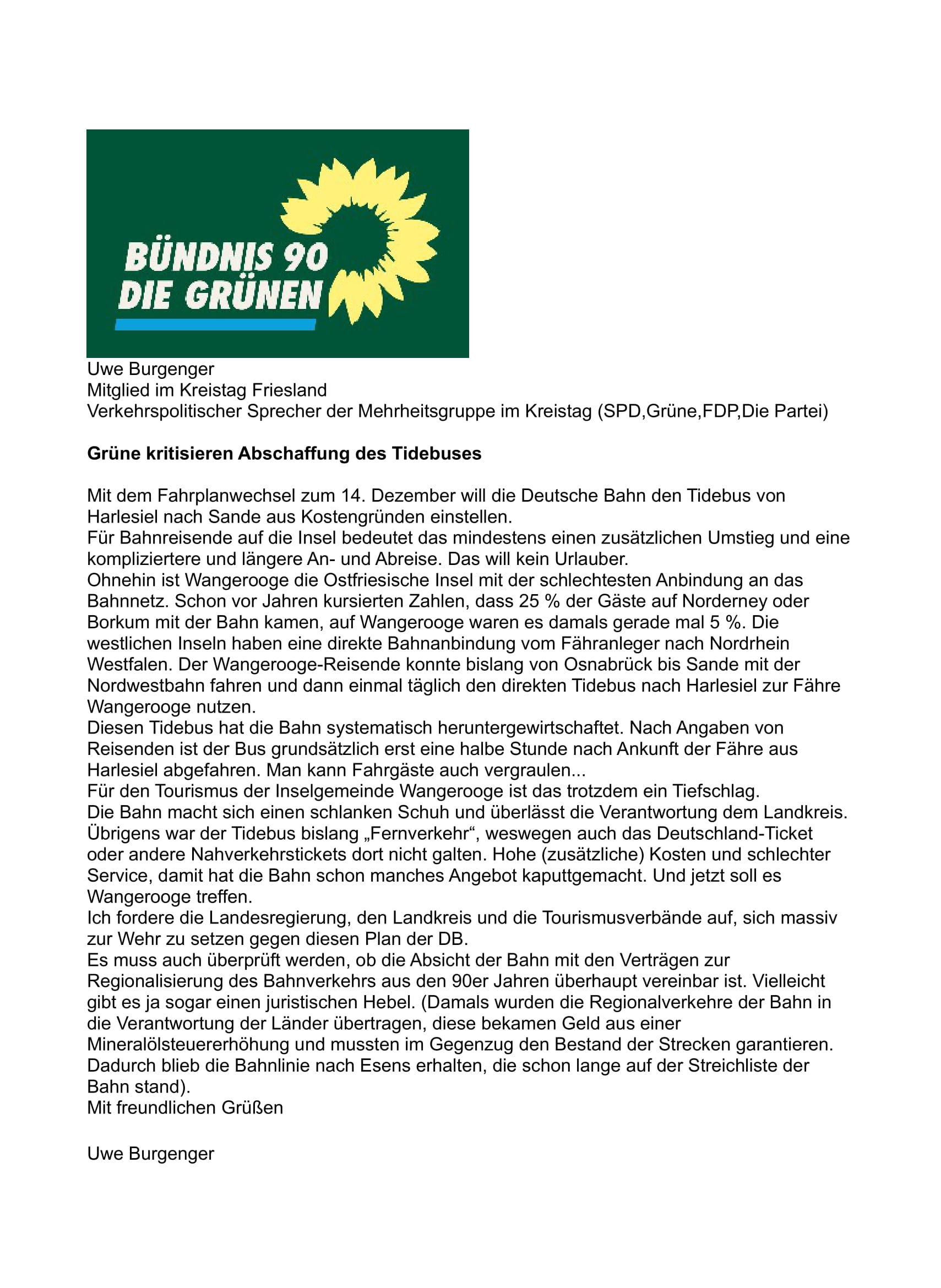 03.10.2025 Pressemitteilung: Grüne kritisieren Abschaffung des Tidebuses - Stellungnahme Betriebsausschuss zur Informationen „Tidebus zwischen Harlesiel und Sande entfällt ab dem 14. Dezember“ - soll zukünftig ab Esens fahren