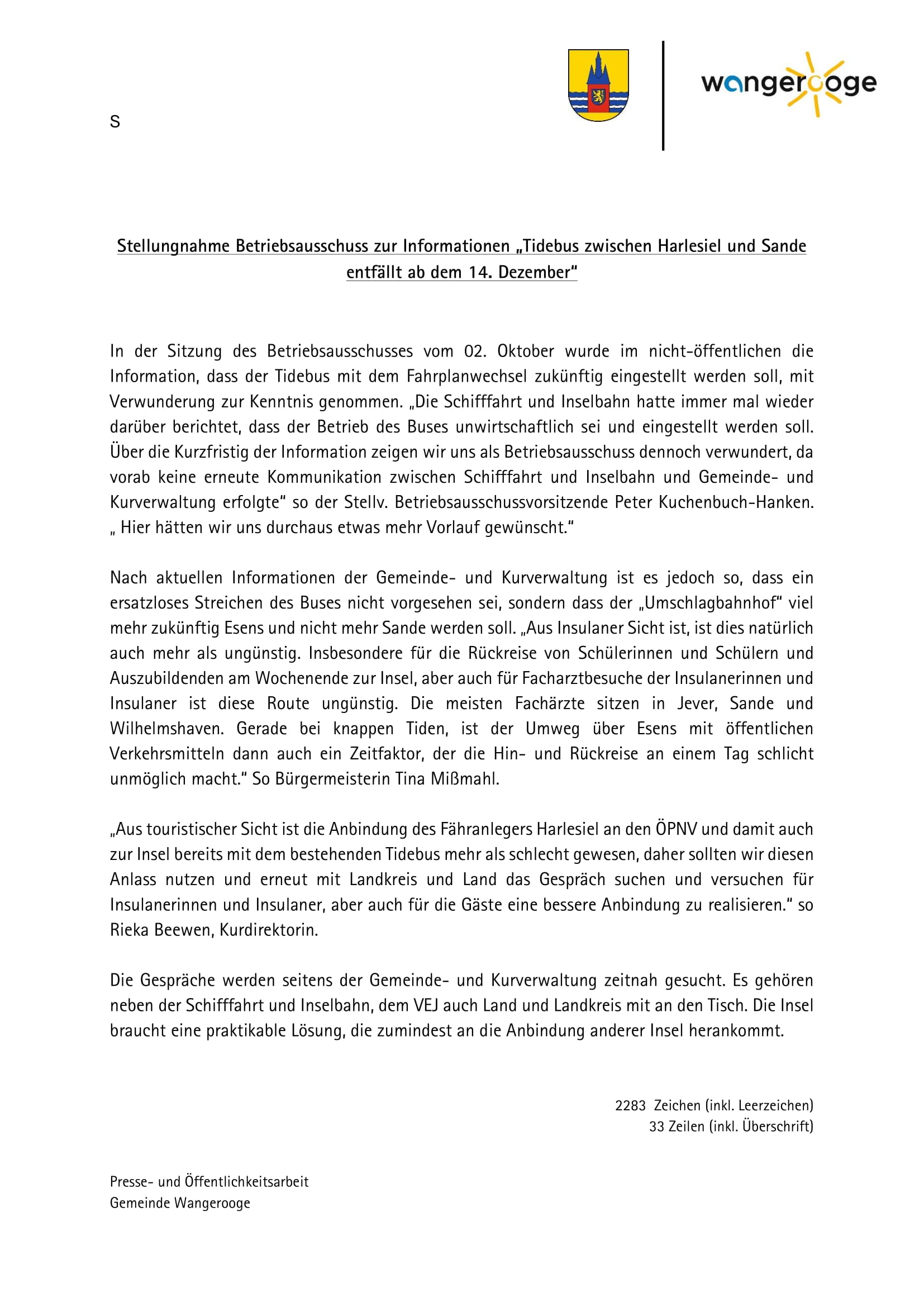Ein Vertreter des Landesverbandes Pro Bahn Niedersachsen e.V. wusste dort zu berichten, dass die DB/SIW Wangerooge die Abschaffung des Tidesbusses ab Sande zu Mitte Dezember 2025 planen würde.