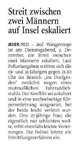 Jeversches Wochenblatt Leute 04.12.2025 Jeversches Wochenblatt – Streit zwischen zwei Männern auf der Insel eskaliert 3. Dezember 20253. Dezember 2025 peter Post Views: 5