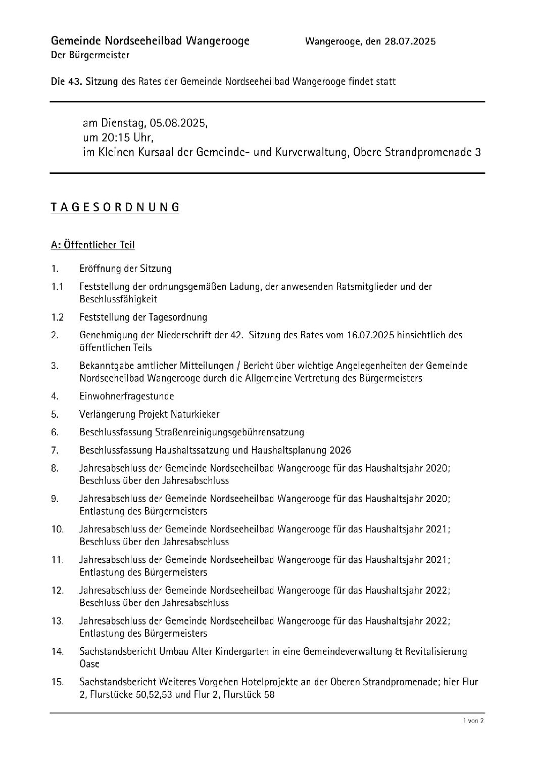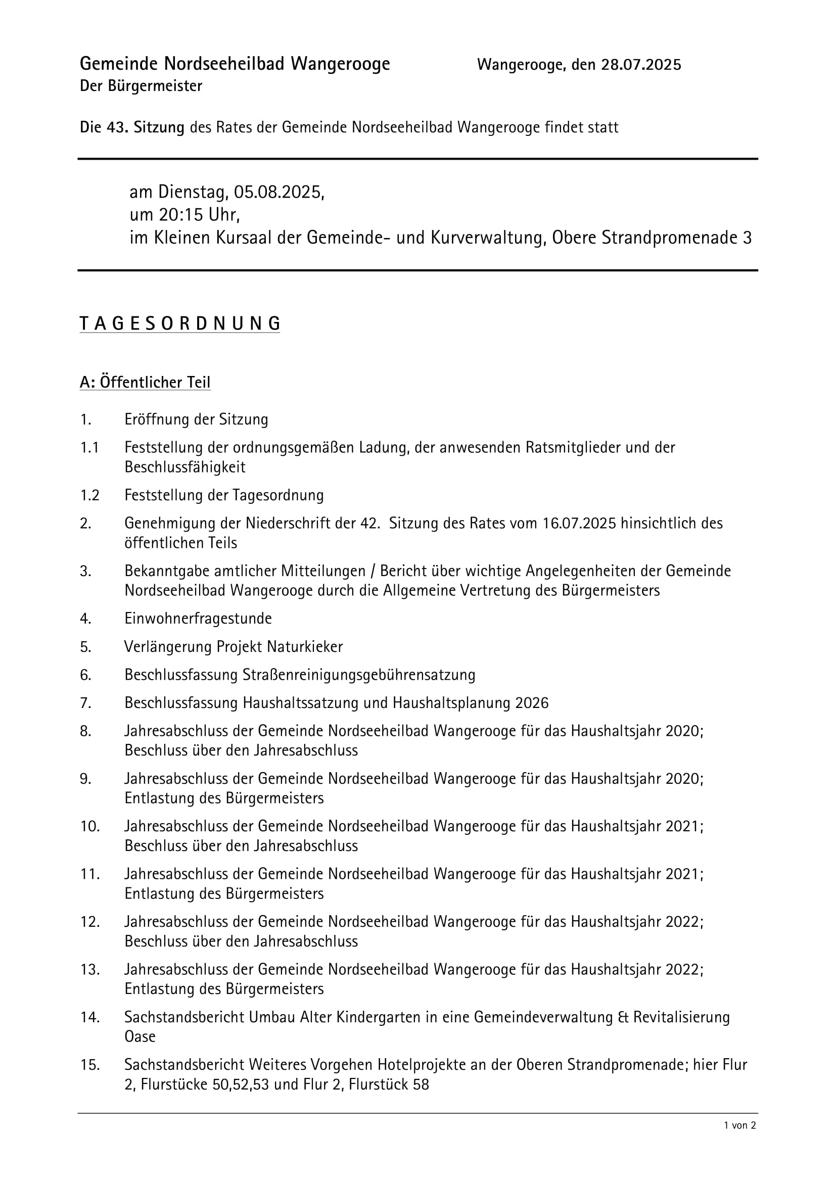 05.08.2025 Heute Öffentliche Ratssitzung um 20.15 Uhr im "Oberdeck" nicht im "Kleinen Kursaal"