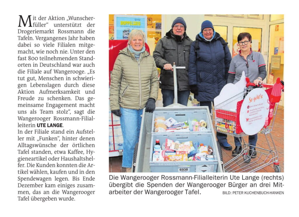 Aktuelles Leute 06.01.2025 Jeversches Wochenblatt – Spendenübergabe im Rahmen der Aktion “Wunscherfüller” der Rossmann-Filiale an die Tafel auf Wangerooge 5. Januar 20265. Januar 2026 peter 06.01.2025 Jeversches Wochenblatt - Spendenübergabe im Rahmen der Aktion "Wunscherfüller" der Rossmann-Filiale an die Tafel auf Wangerooge Post Views: 783