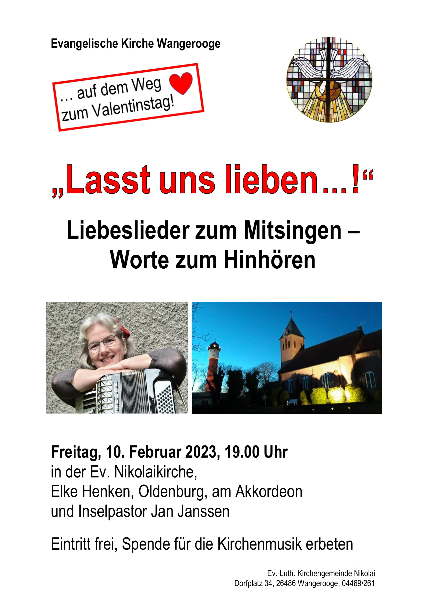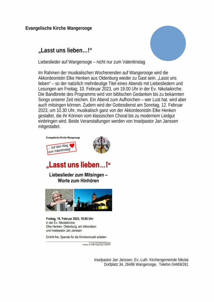 Aktuelles Leute 06.02.2023 “Liebeslieder zum Mitsingen – Worte zum Hinhören” Elke Henken und Pastor Jan Janssen – ev. Nikolaikirche Fr.10.02.23 – 19.00 Uhr 6. Februar 20236. Februar 2023 peter Post Views: 563