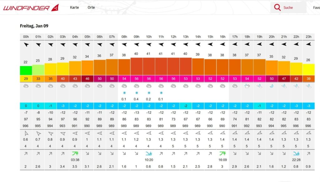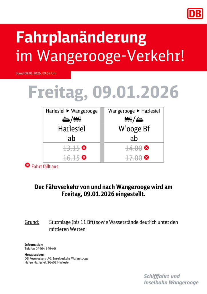 Aktuelles Leute See 07.01.2026 Wetter- und Windlage für Fr.09.01.2026 7. Januar 20268. Januar 2026 peter 07.01.2026 Wetter- und Windlage für Fr.09.01.2026 Für Freitag, den 09.01.2026 warnen die Meteorologen vor starkem Ostwind und Temperaturen im Dauerfrostbereich.Dies wird unweigerlich Auswirkungen auf den Fährbetrieb der DB/SIW haben!Nach Info der DB/SIW werden Donnerstag, den 08.01.2026, vormittags, Verbindungshinweise veröffentlicht werden. 07.01.2026 ZDF heute: Warnungen vor Neuschnee und Glätte : Deutschland vor "Wetterkrimi": Sorgt Sturmtief für Chaos? Bombenzyklon peitscht Schneesturm nach Deutschland Post Views: 667