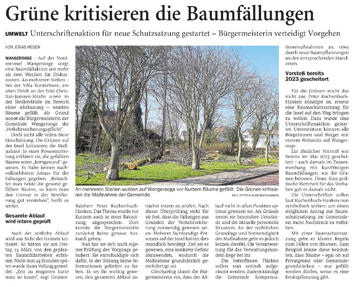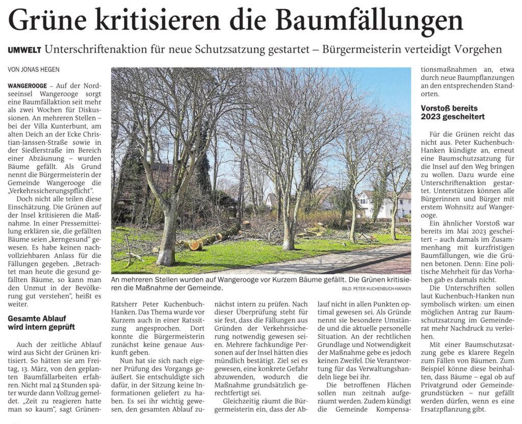 Jeversches Wochenblatt Leute Natur Politik 07.04.2026 Jeversches Wochenblatt – Grüne kritisieren die Baumfällungen 7. April 20267. April 2026 peter Post Views: 27