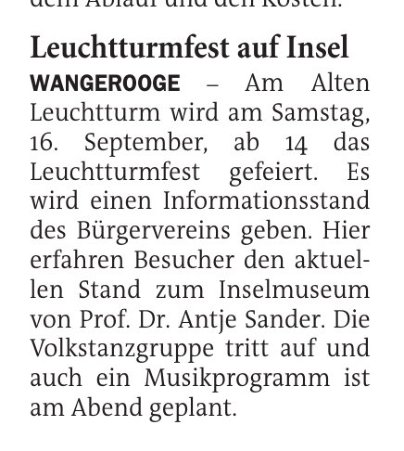 Jeversches Wochenblatt Leute 07.09.2023 Jeversches Wochenblatt – Leuchtturmfest auf Insel 6. September 20236. September 2023 peter Post Views: 534