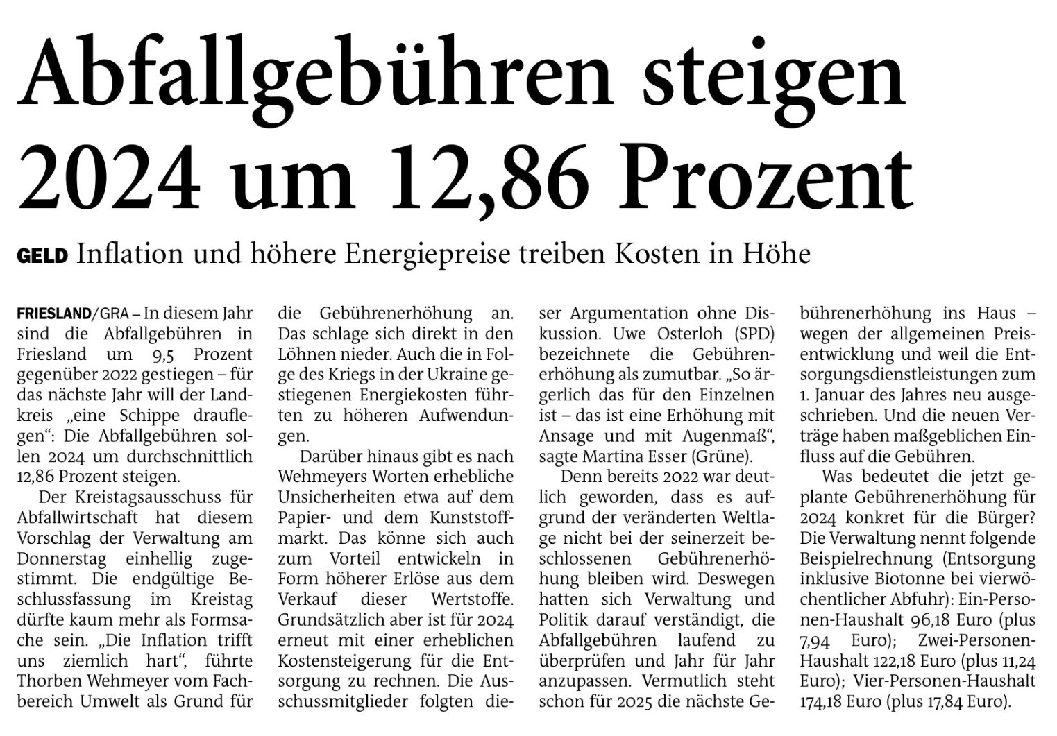 Jeversches Wochenblatt Leute Politik 08.09.2023 Jeversches Wochenblatt – Abfallgebühren steigen 2024 um 12,86 Prozent 7. September 20237. September 2023 peter Post Views: 439