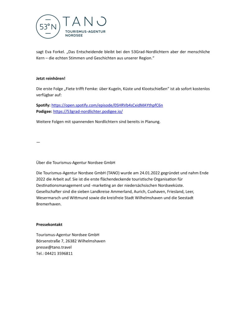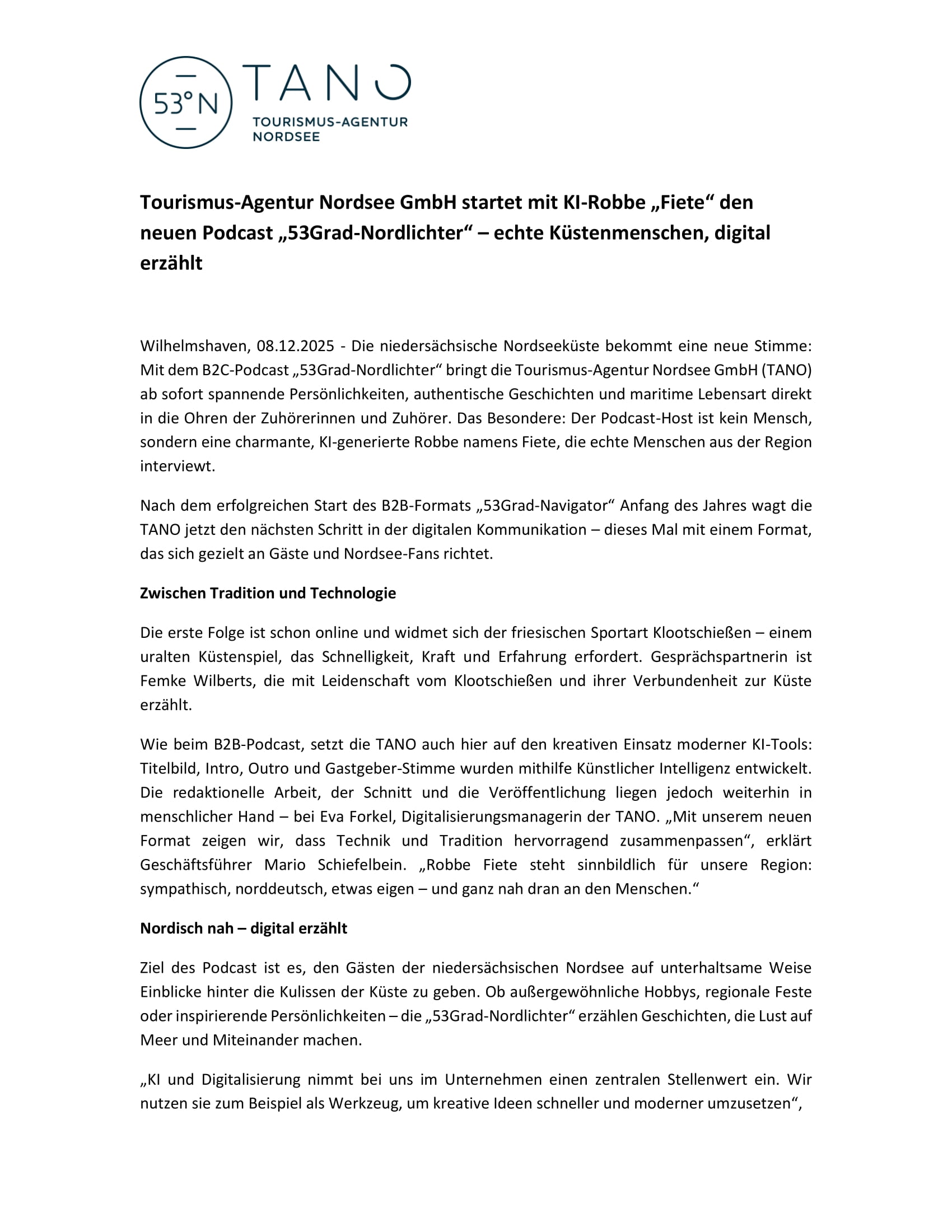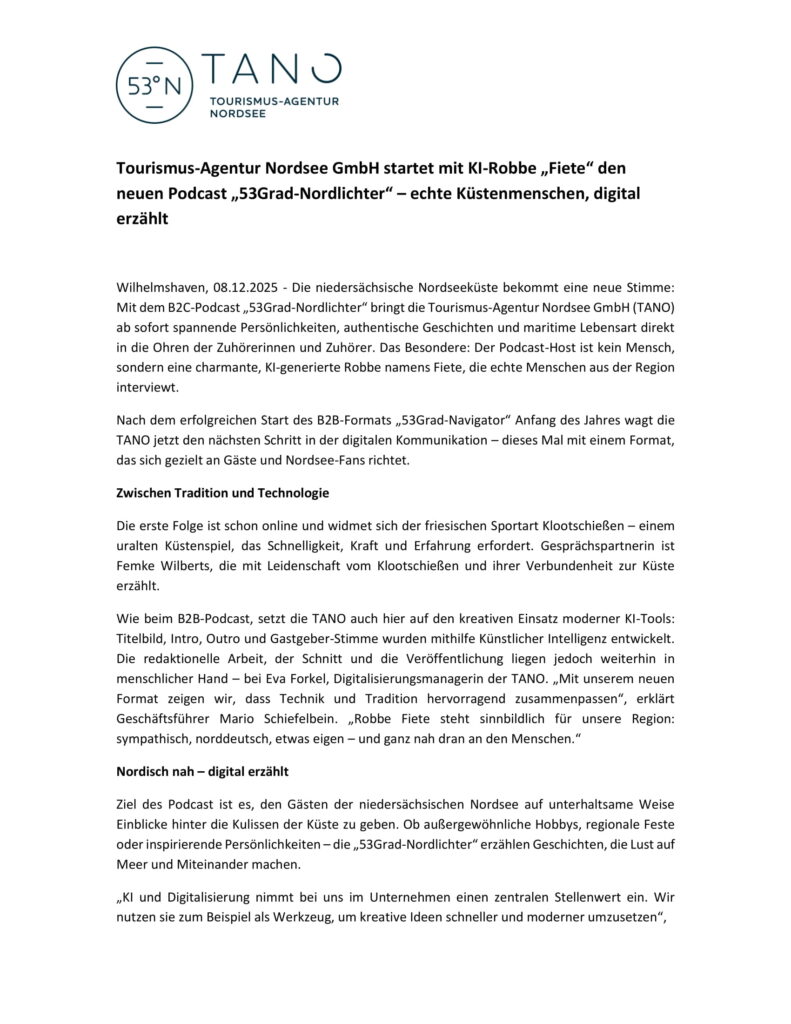 Aktuelles Leute 08.12.2025 Tourismus-Agentur Nordsee GmbH “TANO” startet mit KI-Robbe “Fiete” den neuen Podcast “53Grad-Nordlichter” – echte Küstenmenschen, digital erzählt 8. Dezember 20258. Dezember 2025 peter Post Views: 898