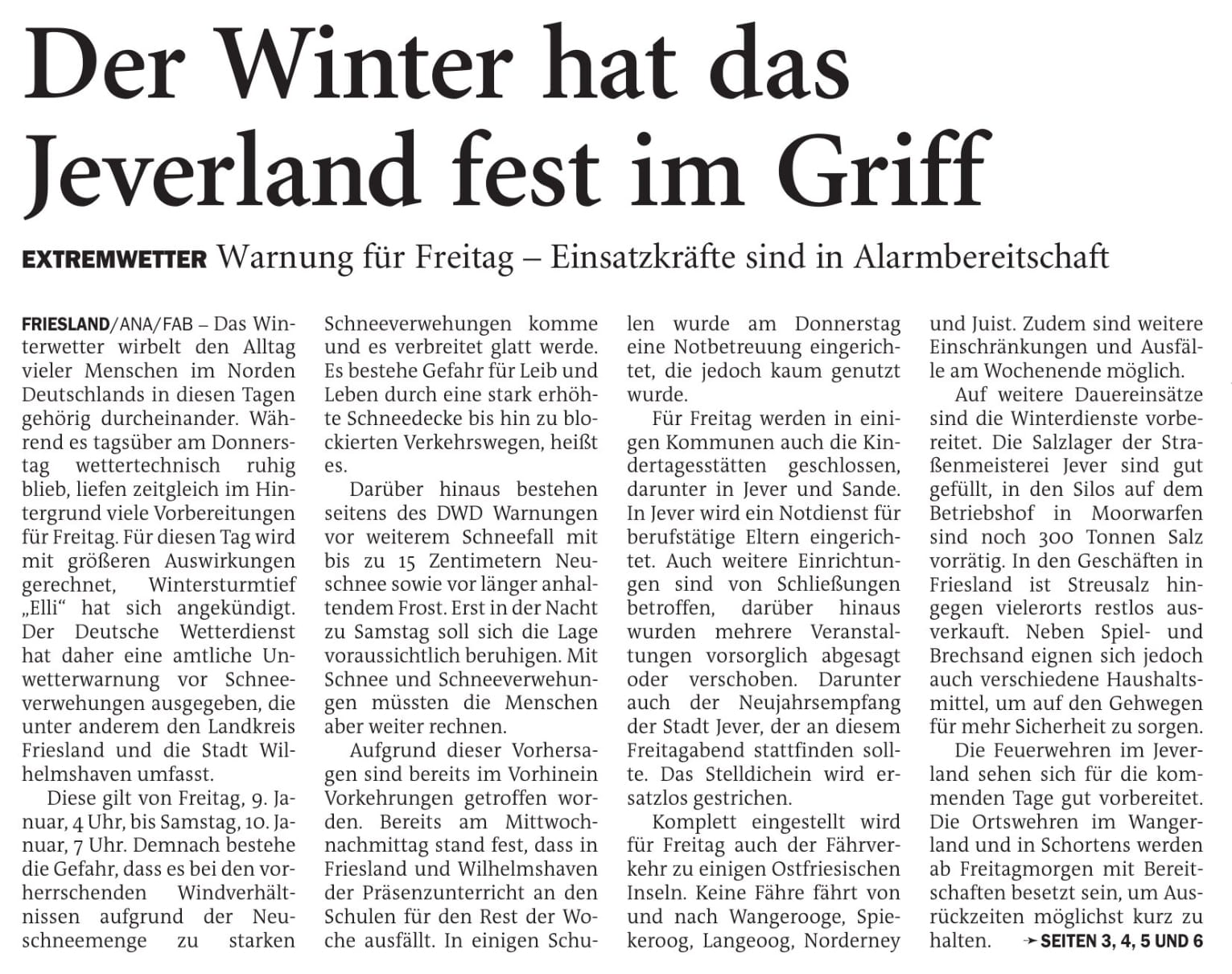 09.01.2026 Jeversches Wochenblatt – Der Winter hat das Jeverland fest im Griff