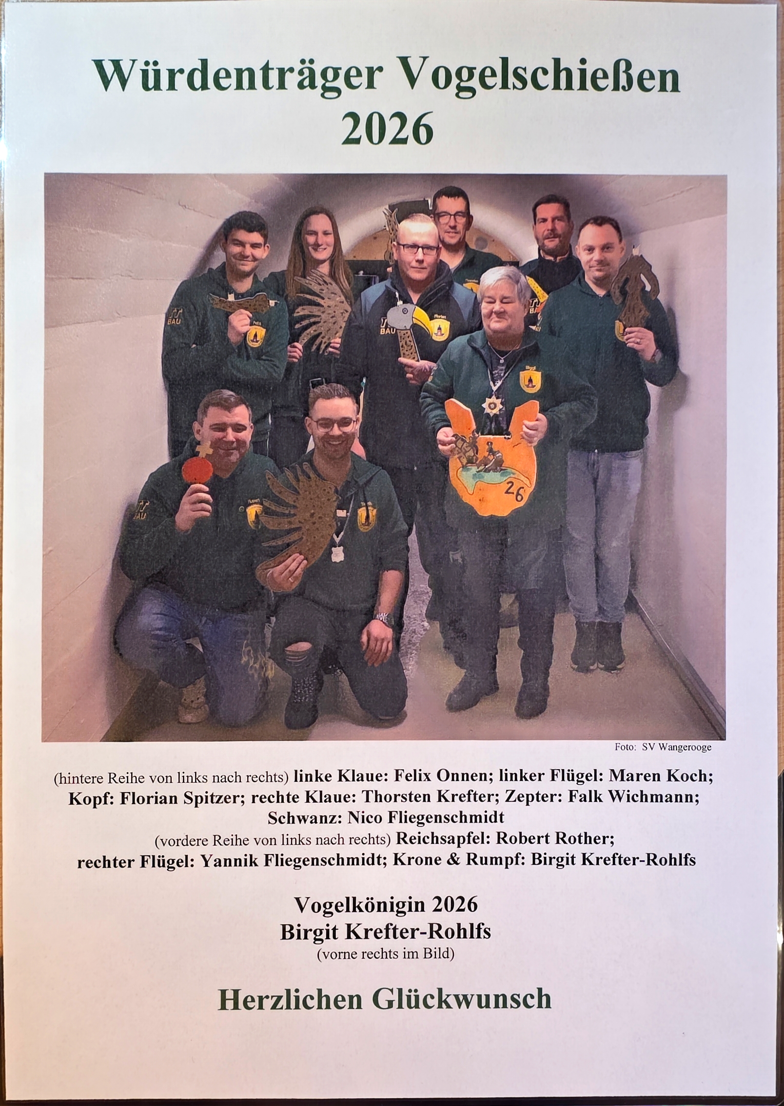 Ein Schützenfest, nach dem 30.Jubiläumsjahr 2024, fand 2025 nicht statt, trotzdem haben es die Wangerooger Schützen sich nicht nehmen lassen, ein neues Königshaus auszuschießen. Elf Schützen versuchten ihr Geschick auf der Königsscheibe und drei Schützen auf der Kaiserscheibe. Nach erfolgter Auswertung standen folgende Würdenträger fest und wurden proklamiert.