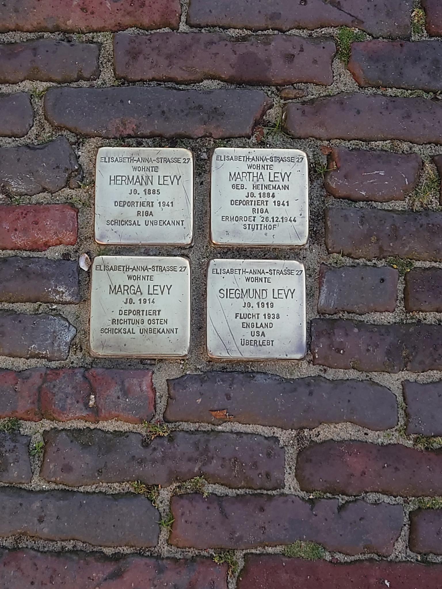 1909 kaufte August Levy in der Elisabeth-Anna-Straße ein Grundstück. Darauf baute er ein Haus mit Fleischerei und Ladengeschäft. Dieses wurde später von seinem Sohn Hermann (Hugo) mit seiner Frau Martha (geb. Heinemann) übernommen. Hermann und Martha Levy bekamen zwei Kinder.