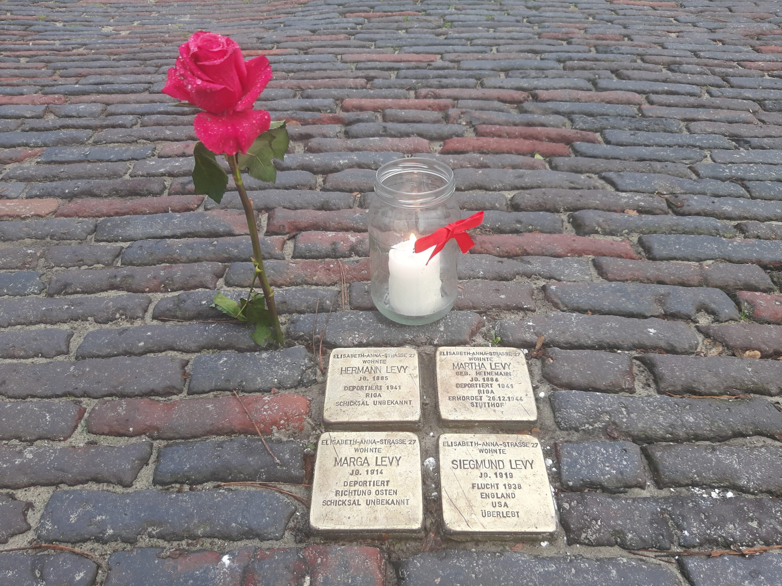 09.11.2025 – 87 Jahre nach der Reichsprogromnacht stellten Unbekannte, zum Gedenken an die von den Nationalsozialisten von der Insel vertriebene Familie Levi, ein Grablicht und eine Rose auf bei den Stolpersteinen auf