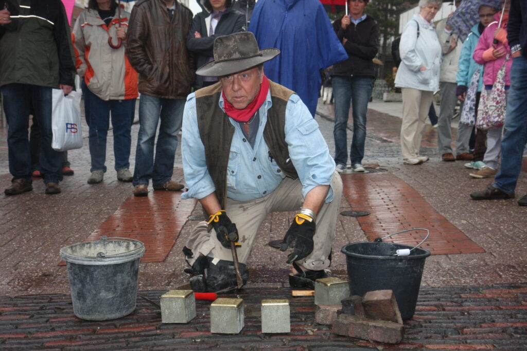 Gunter Demnig verlegt im Mai 2011 im Kreuzungsbereich Elisabeth-Anna-Straße vier Stolpersteine zum Gedenken an die von den Nationalsozialisten von der Insel deportierten jüdischen Familie Levi.