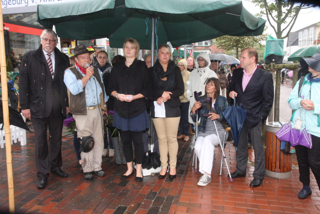 v.l.n.r. Bürgermeister Holger Kohls, Künstler Gunter Demnig, Janna Wilhelmi und Martje Lindner der Abgängerklasse 2007 der Inselschule Wangerooge, Susanne Spremberg (Lebensgefährtin von Ruben Heinemann), Ruben Heinemann (Nachfahre von der ermordeten Martha Levy geborene Heinemann), im Mai 2011 eigens zur Steinlegung aus Herford auf die Insel angereist.