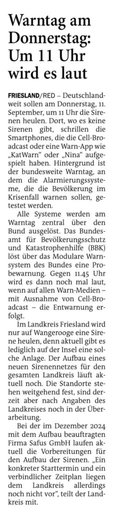 Jeversches Wochenblatt Leute Politik 10.09.2025 Jeversches Wochenblatt – Warntag m Donnerstag: Um 11.00 Uhr wird es laut 9. September 20259. September 2025 peter Post Views: 1.164