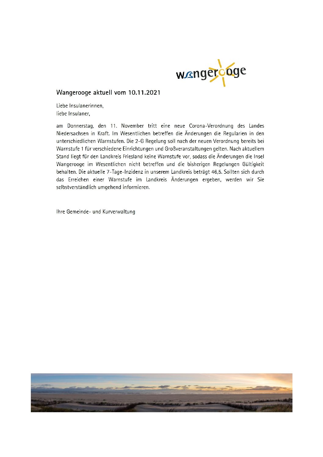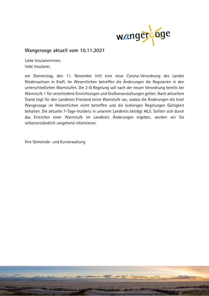 Aktuelles Leute Politik 10.11.2021 Wangerooge Aktuell der Kurverwaltung bezgl. am Donnerstag, den 11. November tritt eine neue Corona-Verordnung des Landes Niedersachsen in Kraft 11. November 202111. November 2021 peter Post Views: 244
