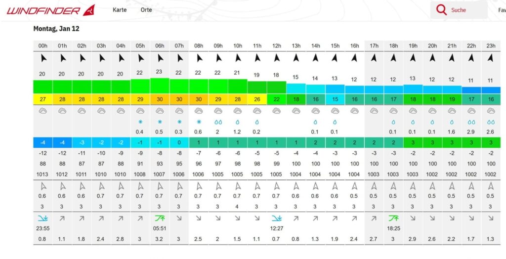Kurz nach Sonnenaufgang rechnen die Wetterdienste mit Regen und steigenden Temperaturen für die Insel Wangerooge. Der Regen trifft dann auf den noch gefrorenen Boden und könnte zu extremer Glätte führen!