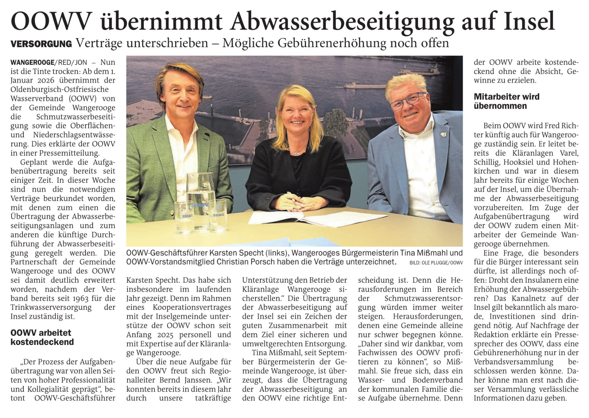 Jeversches Wochenblatt Leute Politik 11.11.2025 Jeversches Wochenblatt – OOWV übernimmt Abwasserbeseitigung auf Insel 10. November 202510. November 2025 peter Post Views: 403