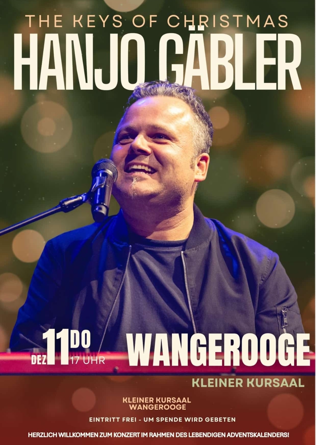 Gut 50 Zuschauer kamen heute Nachmittag um 17.00 Uhr in den Kleinen Kursaal auf Wangerooge zu Hanjo Gäblers Konzert „ The keys of Christmas“. Für die Jahres- und Tageszeit eine gute Besucherzahl. Gäbler liebt es, altbekannte Songs wie "Rudolph, the rednosed reindeer", "White Christmas" und ähnliche zu verjazzen. Der Eintritt für das Konzert von diesem tollen Pianisten war frei, um Spenden wurde gebeten. Nebenbei berichtete Gäbler über vergangene und zukünftige Projekte und natürlich gab es Mitsing-Lieder wie "Oh du fröhliche, "Go, tell it on the mountain", "Herbei, oh ihr Gläubigen". Text, Fotos und Videos: Uschi Boog