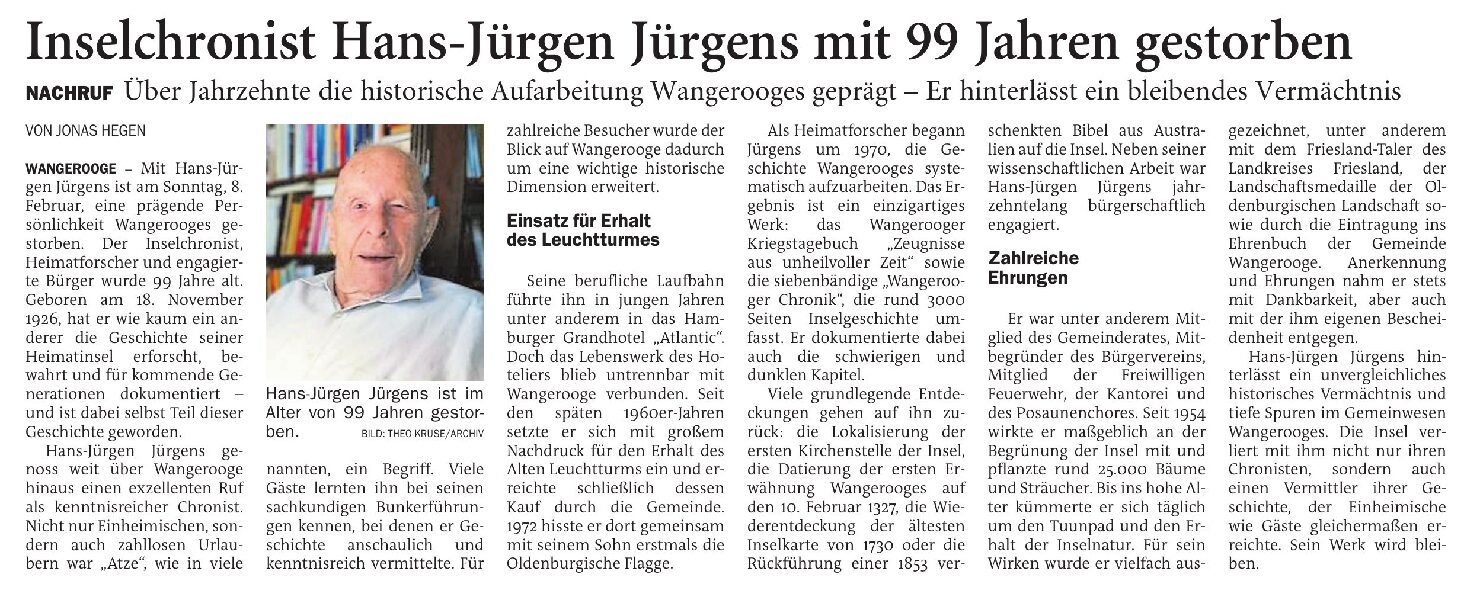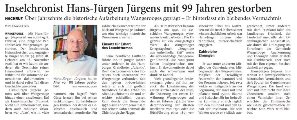Jeversches Wochenblatt Leute 12.02.2026 Jeversches Wochenblatt – Inselchronist Hans-Jürgen Jürgens mit 99 Jahren gestorben 11. Februar 202611. Februar 2026 peter Post Views: 3