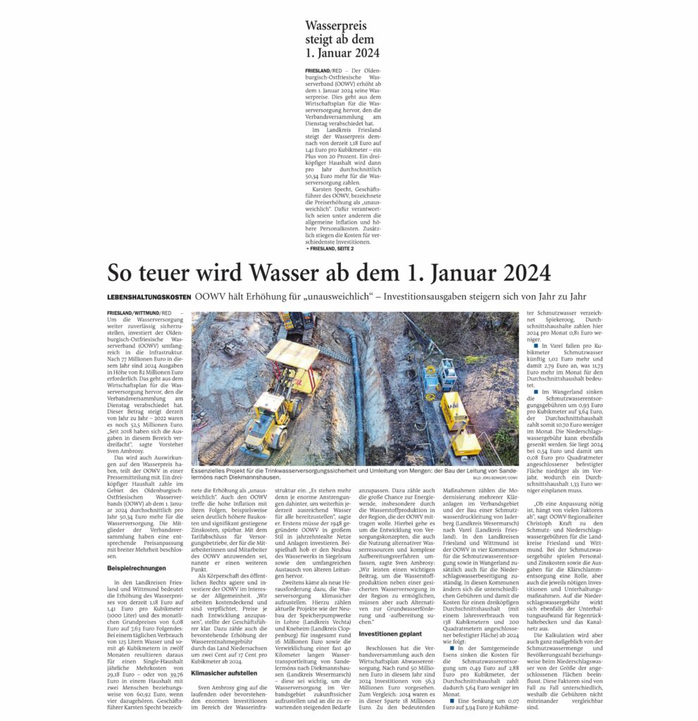 Jeversches Wochenblatt Leute 13.12.2023 Jeversches Wochenblatt – Wasserpreis steigt ab 01.01.2024 13. Dezember 202313. Dezember 2023 peter Post Views: 598
