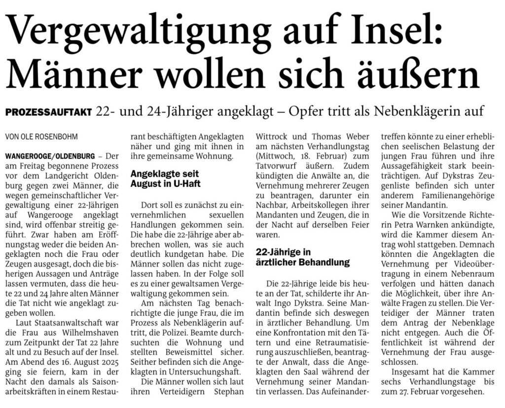 Jeversches Wochenblatt Leute 14.02.2026 Jeversches Wochenblatt – Vergewaltigung auf Insel: Männer wollen sich äußern 13. Februar 202613. Februar 2026 peter Post Views: 7