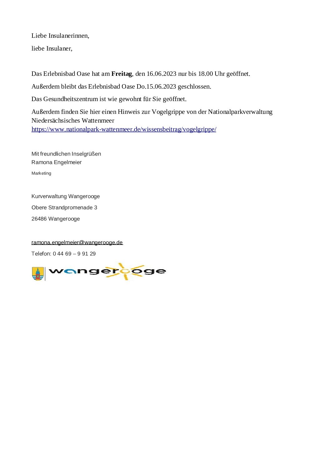 Aktuelles Leute 14.06.2023: Infos Erlebnisbad “OASE”: Do.15.06.23 geschlossen – Fr. 16.06.23 nur bis 18.00 Uhr – Gesundheitszentrum geöffnet – Hinweis Nationalparkverwaltung zur Vogelgrippe 14. Juni 202314. Juni 2023 peter 14.06.2023: Infos Erlebnisbad “OASE”: Do.15.06.23 geschlossen – Fr. 16.06.23 nur bis 18.00 Uhr – Gesundheitszentrum geöffnet – Hinweis Nationalparkverwaltung zur Vogelgrippe Post Views: 273