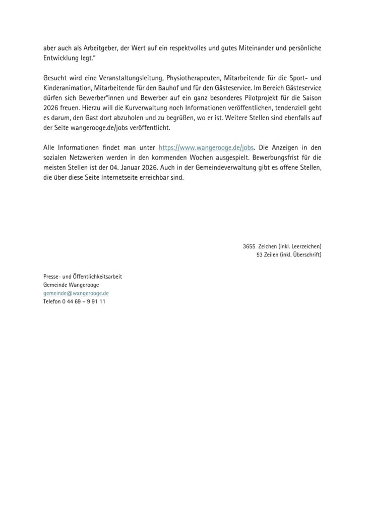 Aktuelles Leute Politik 14.11.2025 Fachkräftekampagne für die Kurverwaltung Wangerooge nach Beschluss im Betriebsausschuss auf den Weg gebracht 14. November 202514. November 2025 peter 14.11.2025 Fachkräftekampagne für die Kurverwaltung Wangerooge nach Beschluss im Betriebsausschuss auf den Weg gebracht Post Views: 661