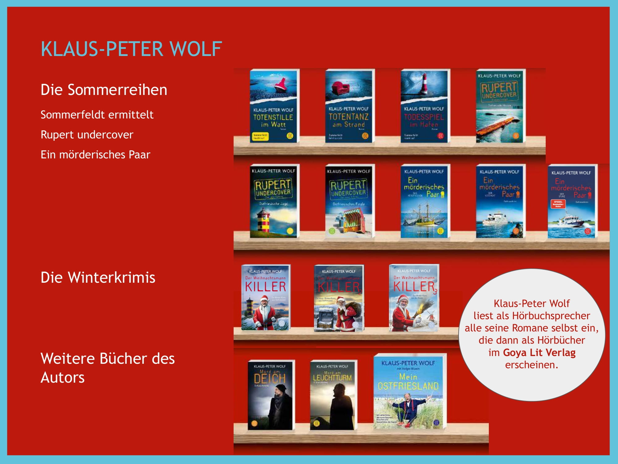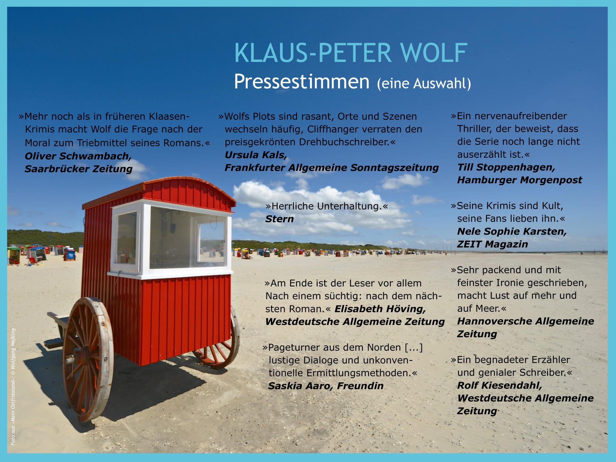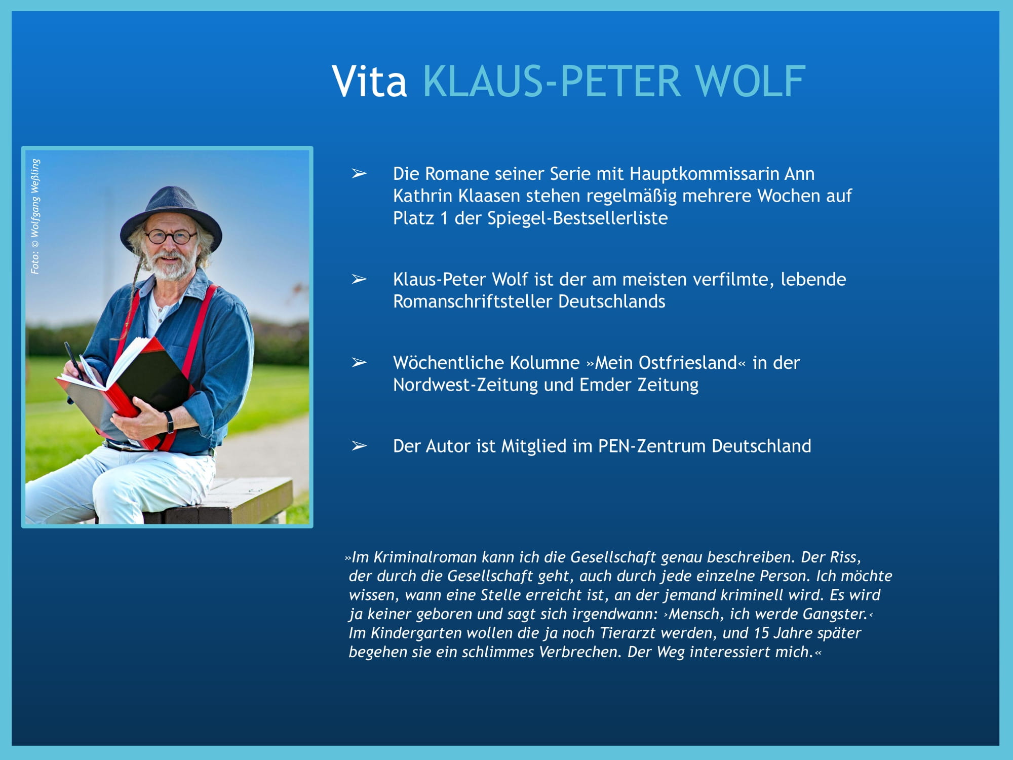 Klaus-Peter Wolf, 1954 in Gelsenkirchen geboren, lebt als freier Schriftsteller in der ostfriesischen Stadt Norden, im selben Viertel wie seine Kommissarin Ann Kathrin Klaasen. Seine Romane stehen regelmäßig auf Platz 1 der Spiegel-Bestseller-Liste, auch die Verfilmungen fürs ZDF sind Quotenrenner zur besten Sendezeit und begeistern Millionen von Zuschauern.