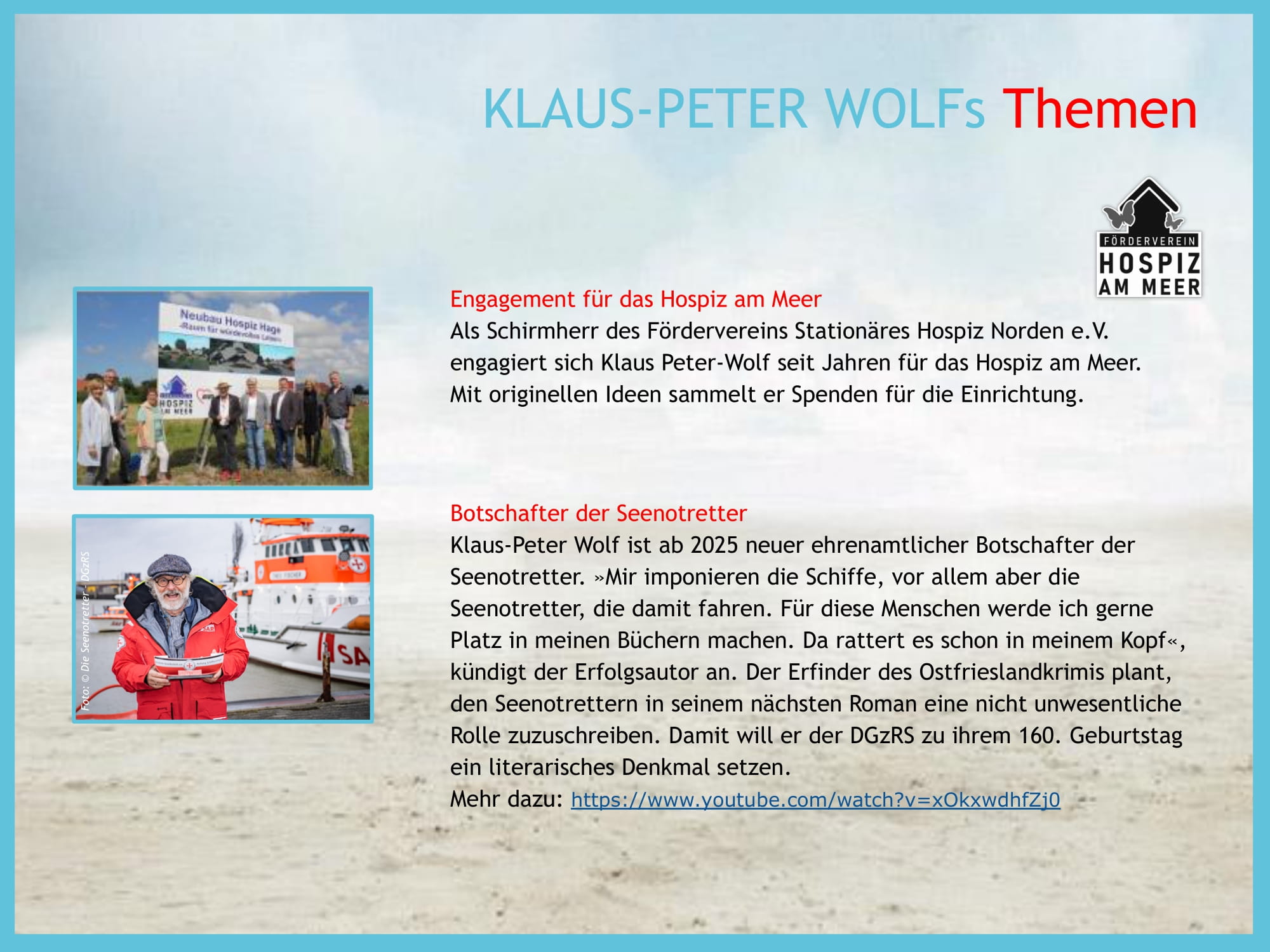 Mit über 15 Millionen verkaufter Bücher und Übersetzungen in 26 Sprachen zählt Klaus-Peter Wolf zu den erfolgreichsten Autoren der letzten Jahre. Hierfür wurde er 2025 mit dem Media Control Premium Award ausgezeichnet. Der Autor ist Mitglied im PEN-Zentrum Deutschland und engagiert sich ehrenamtlich als Schirmherr im Förderverein Stationäres Hospiz Norden e. V. Seit kurzem ist er auch Botschafter der Deutschen Gesellschaft zur Rettung Schiffbrüchiger (DGzRS). Wenn der Autor nicht am nächsten Roman schreibt, dann kann man ihn in seinem Lieblingscafé in Norden treffen, wo er als äußerst erfolgreicher ehrenamtlicher Tortentester fungiert.
