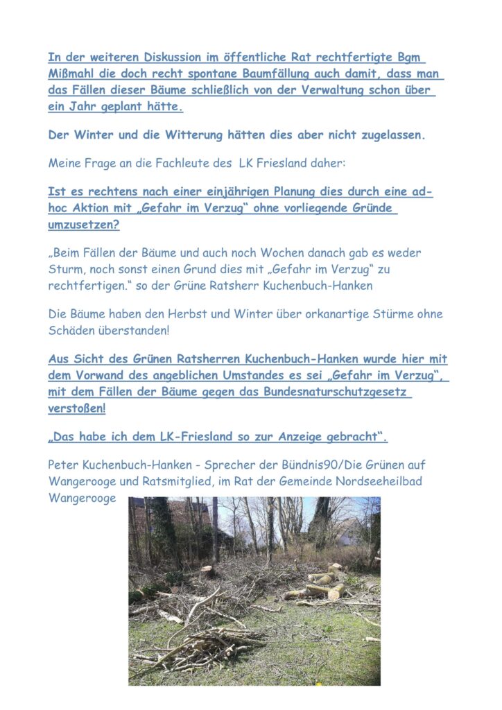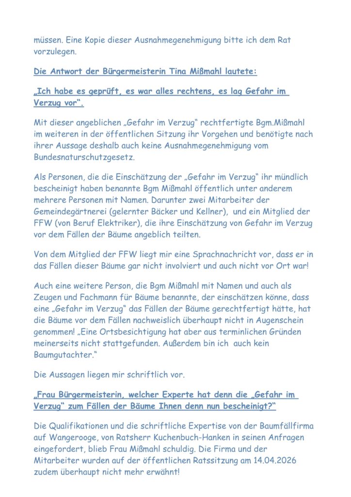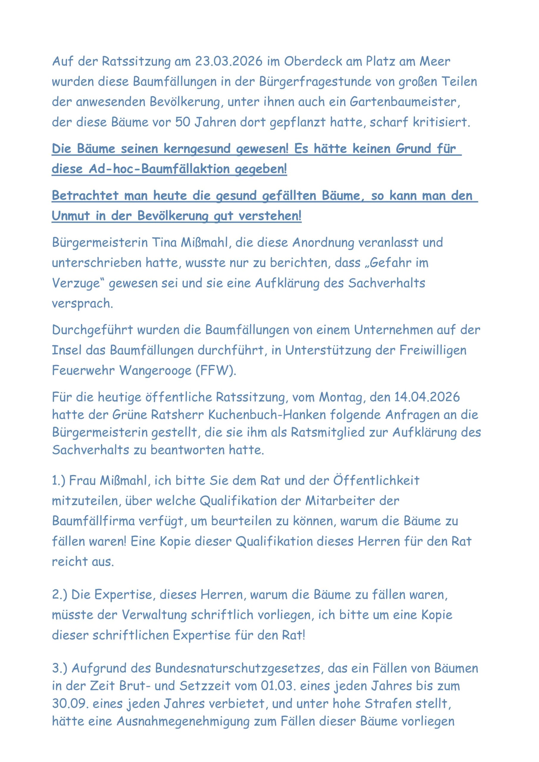 Aktuelles Leute Natur Politik 15.04.2026 Presseinfo 04-26 Die Grünen Wangerooger – Anzeige und Gesuch auf Rechtsauskunft an die Untere Naturschutzbehörde des LK Friesland 15. April 202615. April 2026 peter Presseinfo 04-26 Grüne Wangerooger - Anzeige und Gesuch auf Rechtsauskunft an die Untere Naturschutzbehörde des LK Friesland Post Views: 828