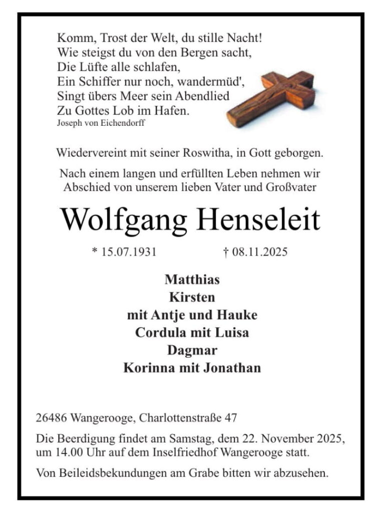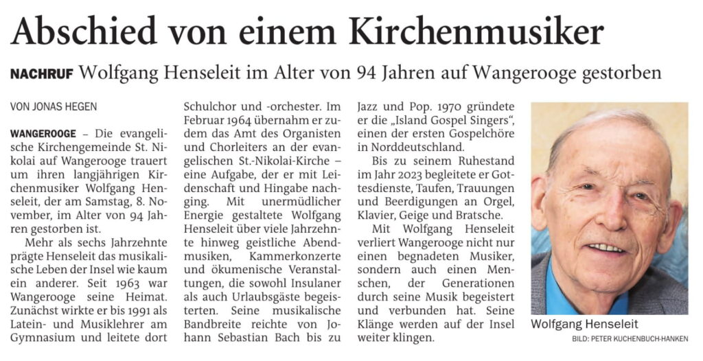 Jeversches Wochenblatt Leute 15.11.2025 Jeversches Wochenblatt – Abschied von einem Kirchenmusiker – NACHRUF – Wolfgang Henseleit im Alter von 94 Jahren auf Wangerooge gestorben 14. November 202516. November 2025 peter Post Views: 997