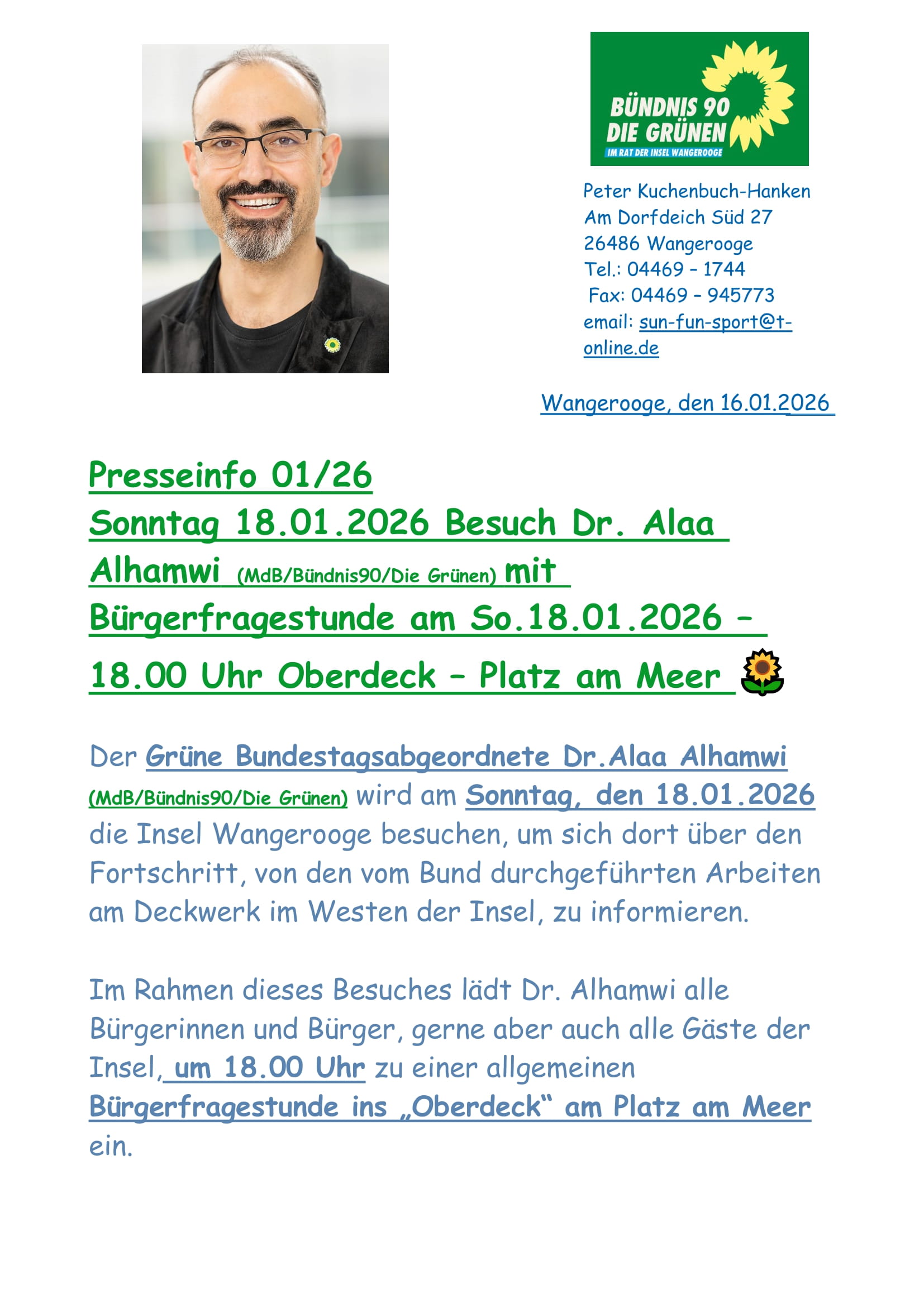 Aktuelles Leute Politik 16.01.2026 Sonntag 18.01.2026 Besuch Dr. Alaa Alhamwi (MdB/Bündnis90/Die Grünen) – Bürgerfragestunde am So.18.01.2026 – 18.00 Uhr Oberdeck – Platz am Meer 🌻 16. Januar 202616. Januar 2026 peter Post Views: 504