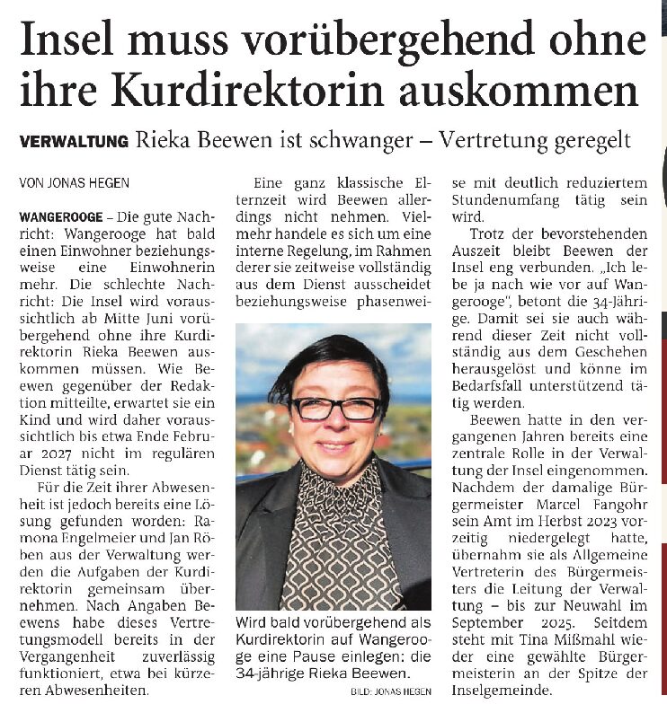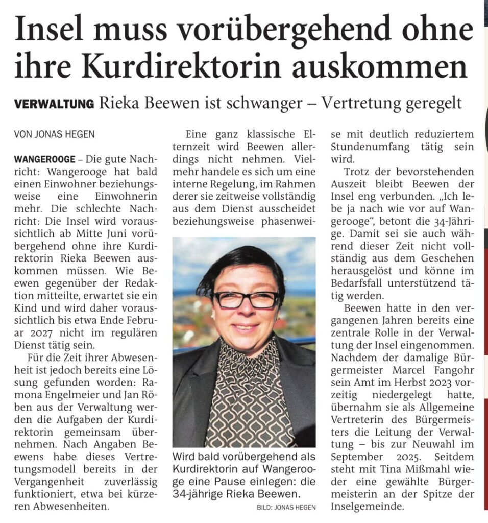 Jeversches Wochenblatt Leute 16.04.2026 Jeversches Wochenblatt – Verwaltung auf Wangerooge – Insel muss bald vorübergehend ohne ihre Kurdirektorin auskommen 15. April 202615. April 2026 peter Post Views: 6