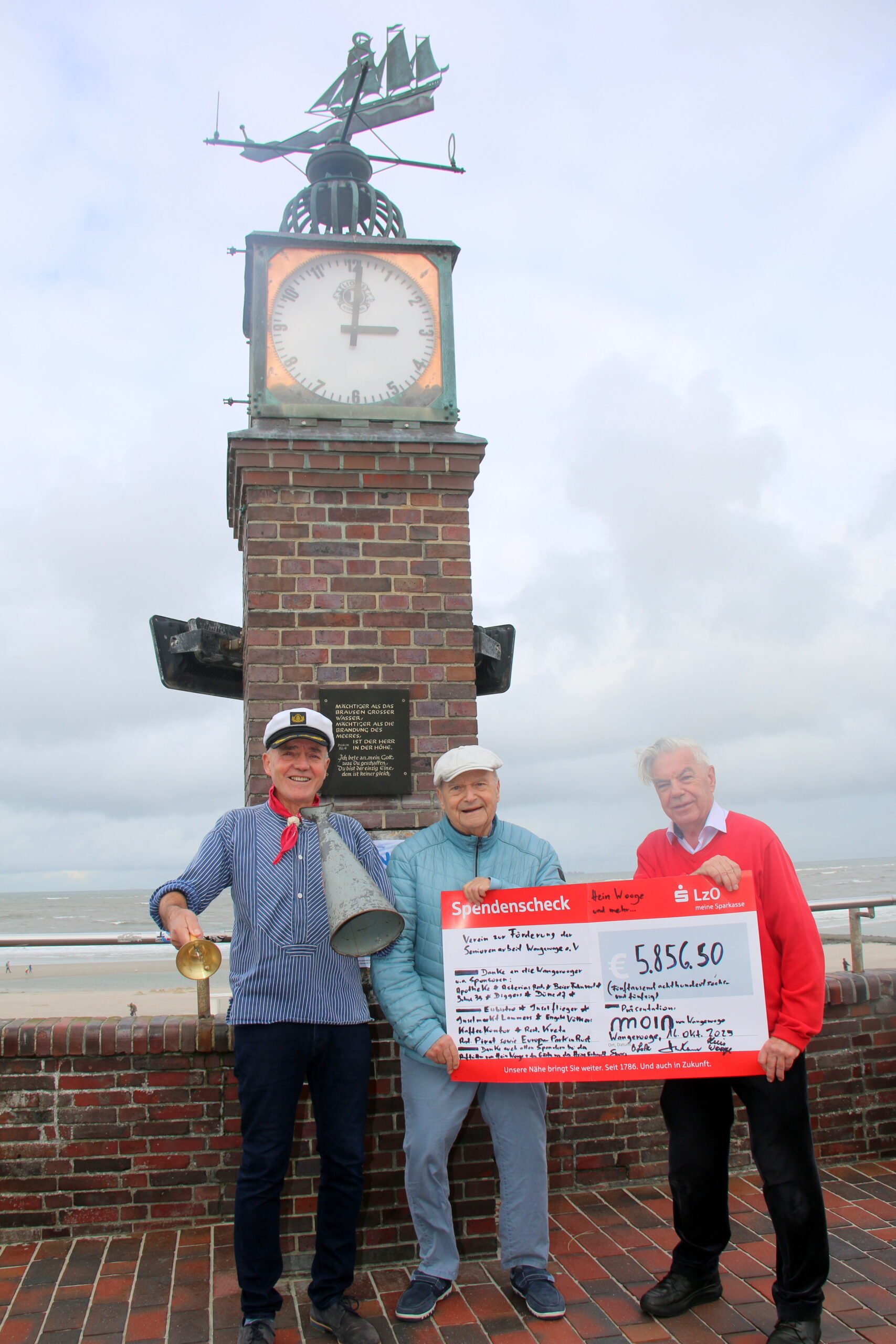 Klaus Brüggerhoff alias “Hein Wooge” und Horst Klemmer übergaben heute an der “Pudding-Uhr” einen Spendenscheck in Höhe von 5.856,50 € an den Vorsitzenden des Vereins zur Förderung der Seniorenarbeit Wangerooge e.V. Bernd Lotte.