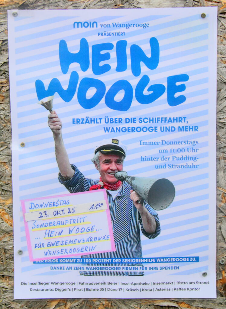 An 10 Donnerstagen in diesem Sommer, jeweils um 11.00 Uhr erzählte “Hein Wooge” den interessierten Gästen an der Pudding-Uhr Geschichten über die Schifffahrt, Wangerooge und Mehr.