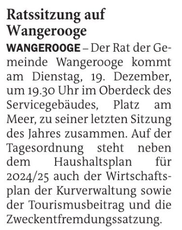 Jeversches Wochenblatt Leute Politik 16.12.2023 Jeversches Wochenblatt – Ratssitzung auf Wangerooge 15. Dezember 202315. Dezember 2023 peter Post Views: 567