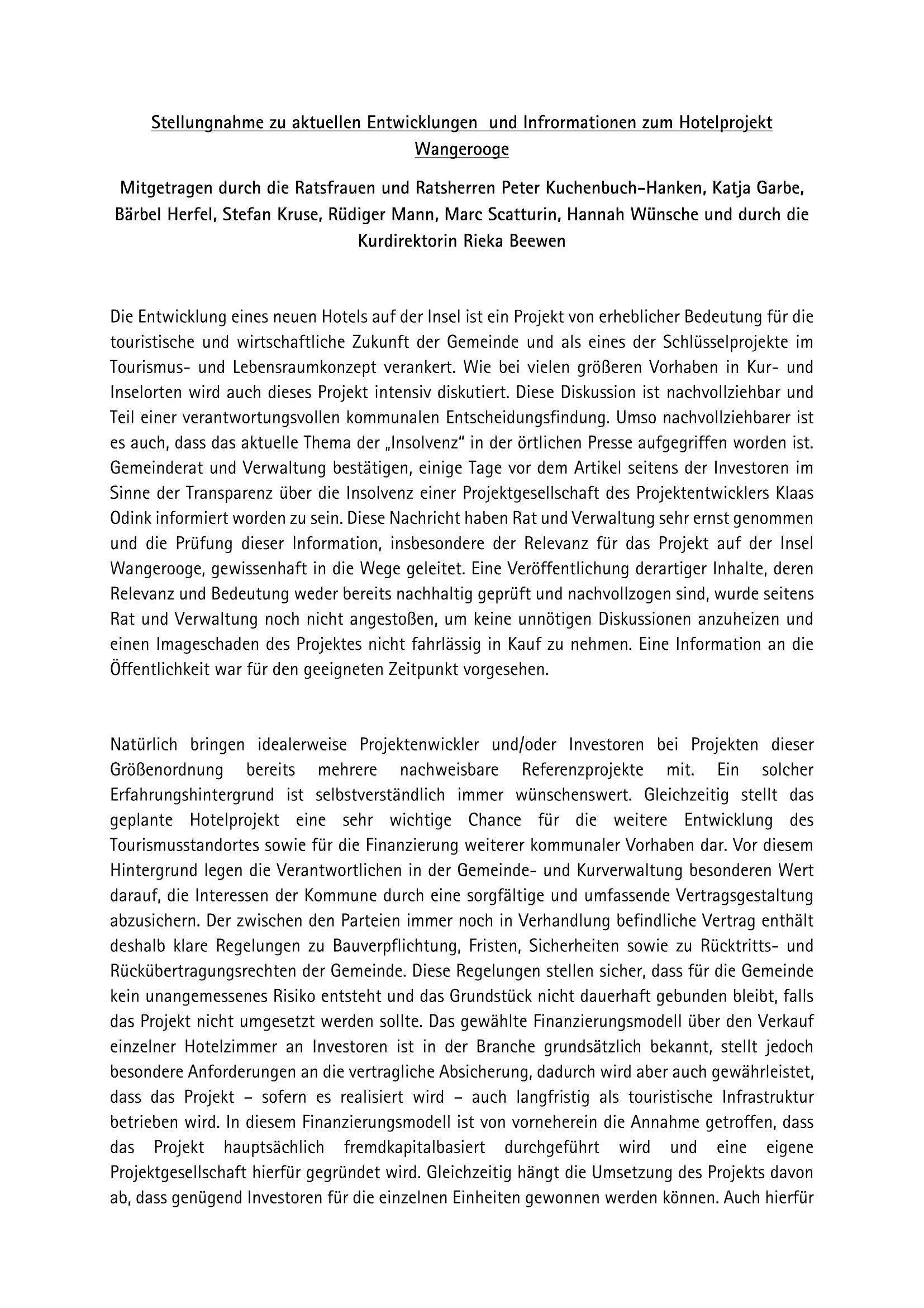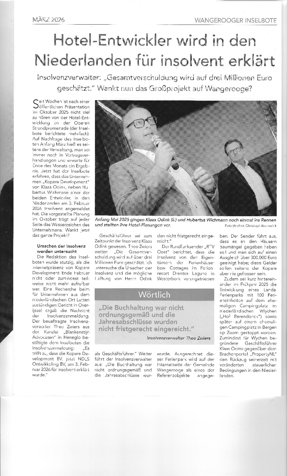 18.03.2026 Stellungnahme von Teilen des Rates und des Investors zum Artikel im Inselboten: “Hotelentwickler wird in den Niederlanden für Insolvent erklärt”