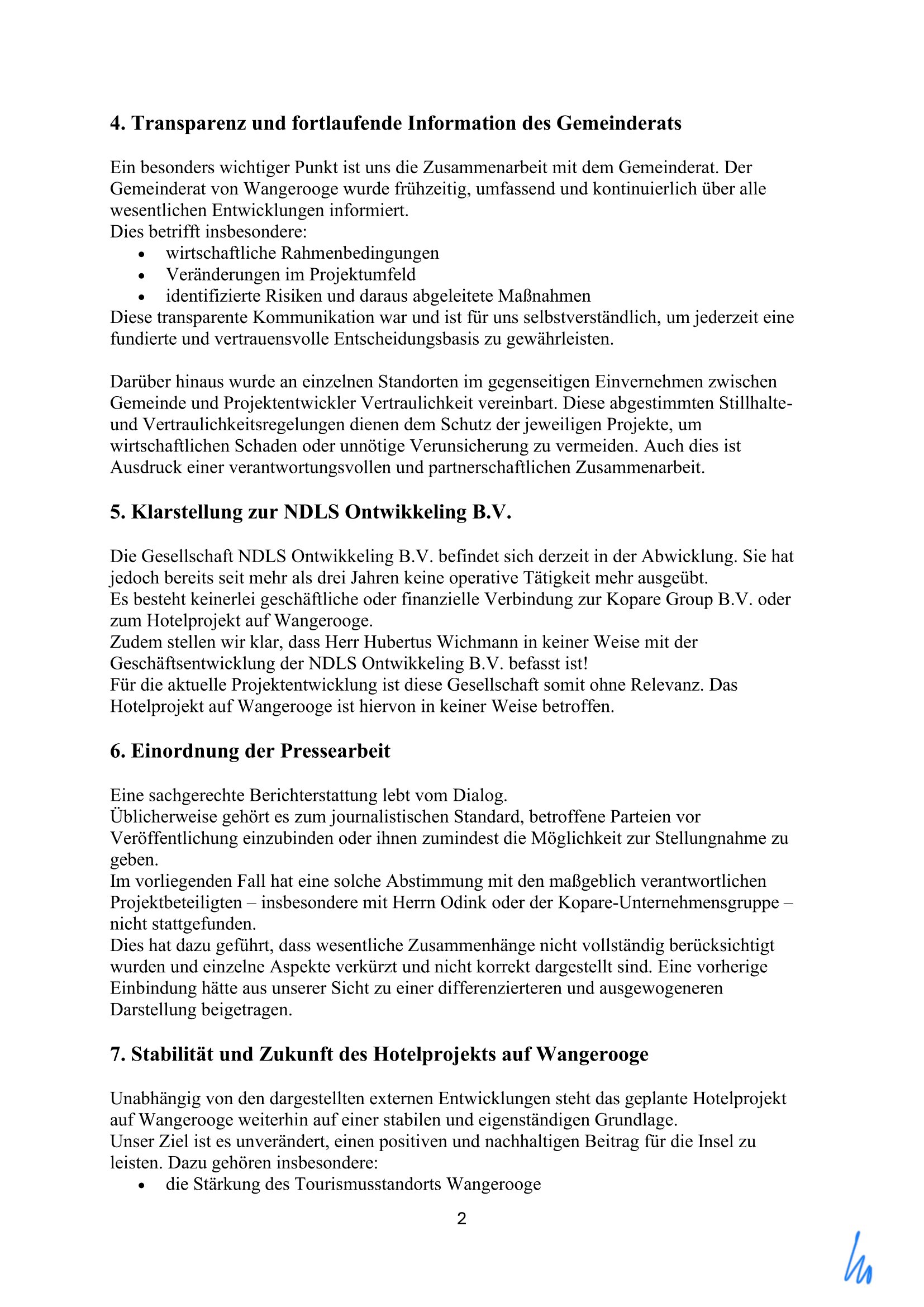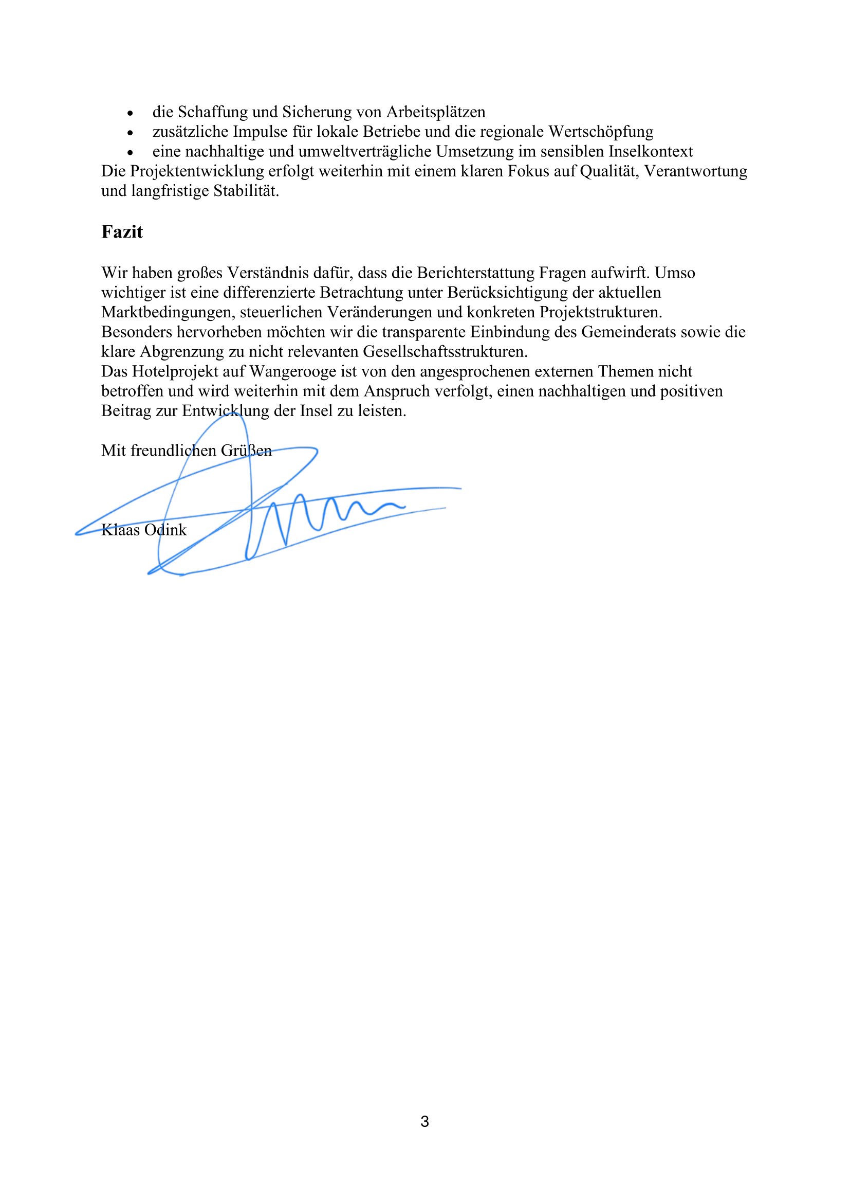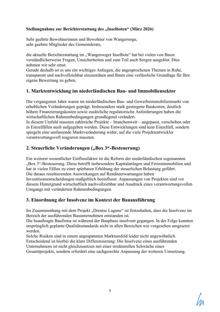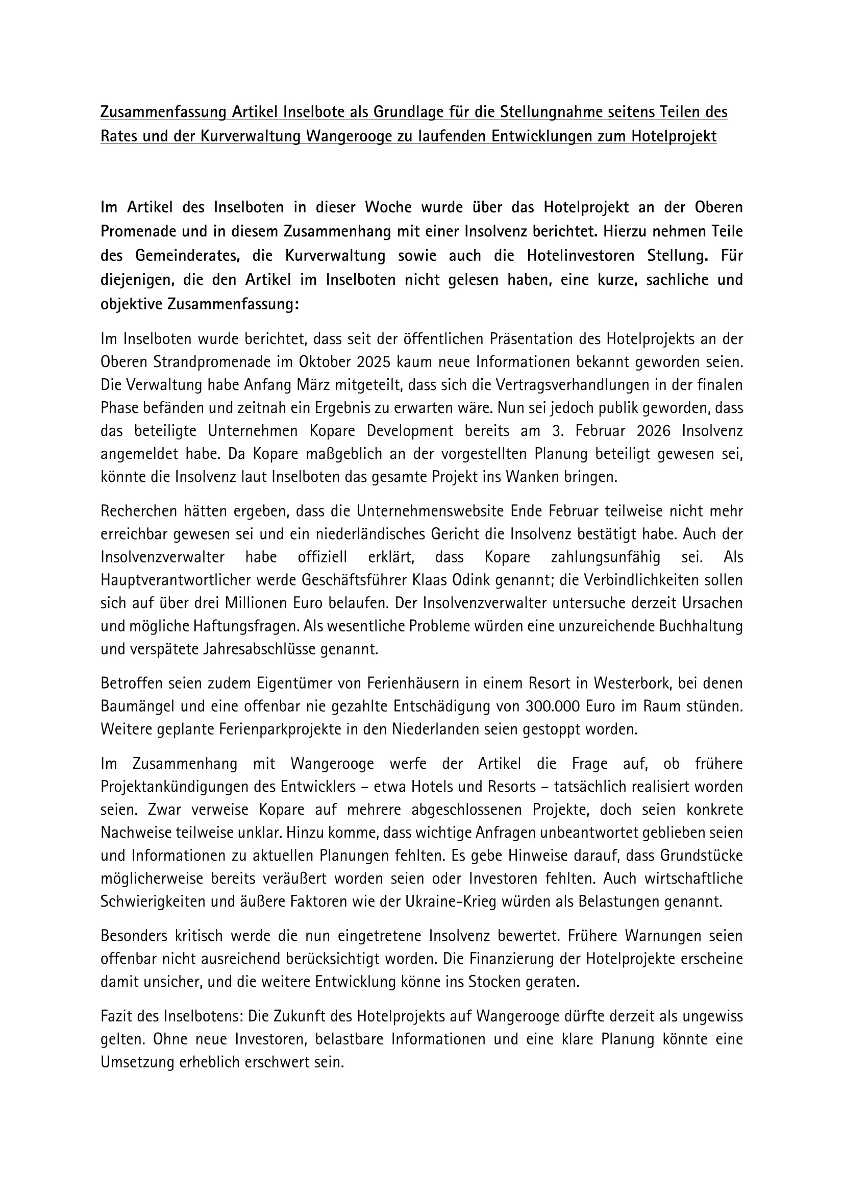 18.03.2026 Stellungnahme von Teilen des Rates und des Investors zum Artikel im Inselboten: "Hotelentwickler wird in den Niederlanden für Insolvent erklärt"
