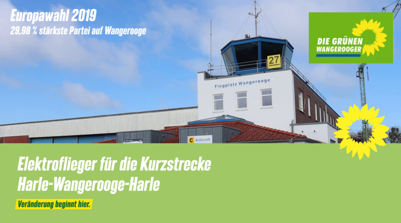 Die Grünen Wangerooger wünschen sich, dass die Inselflieger Elektroflugzeuge auf der Kurzstrecke Harle-Wangerooge einsetzen, technisch ist dieses längst möglich. Die Gemeinde hat als Betreiber des Flugplatzes die Möglichkeit dies mittelfristig einzufordern.