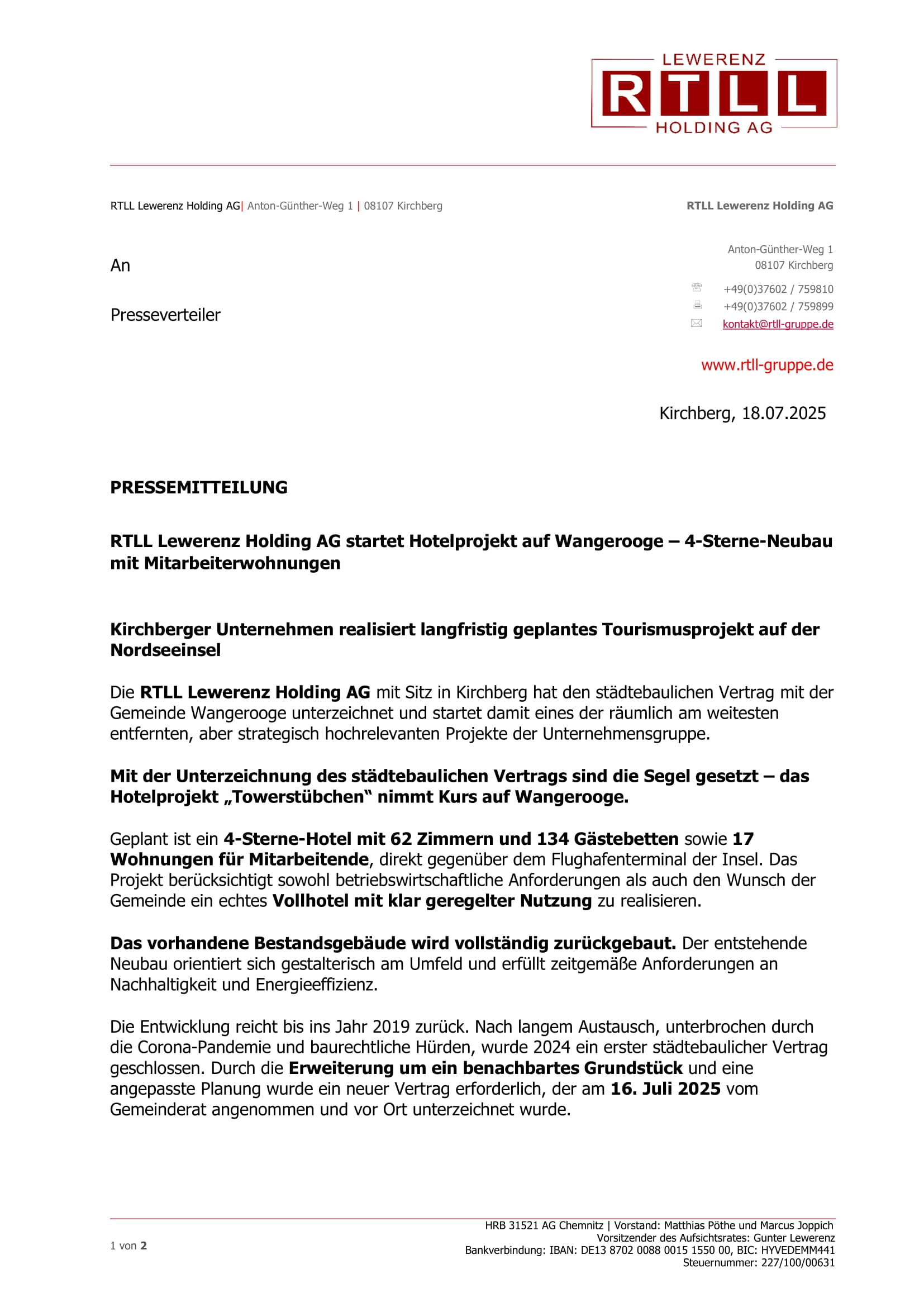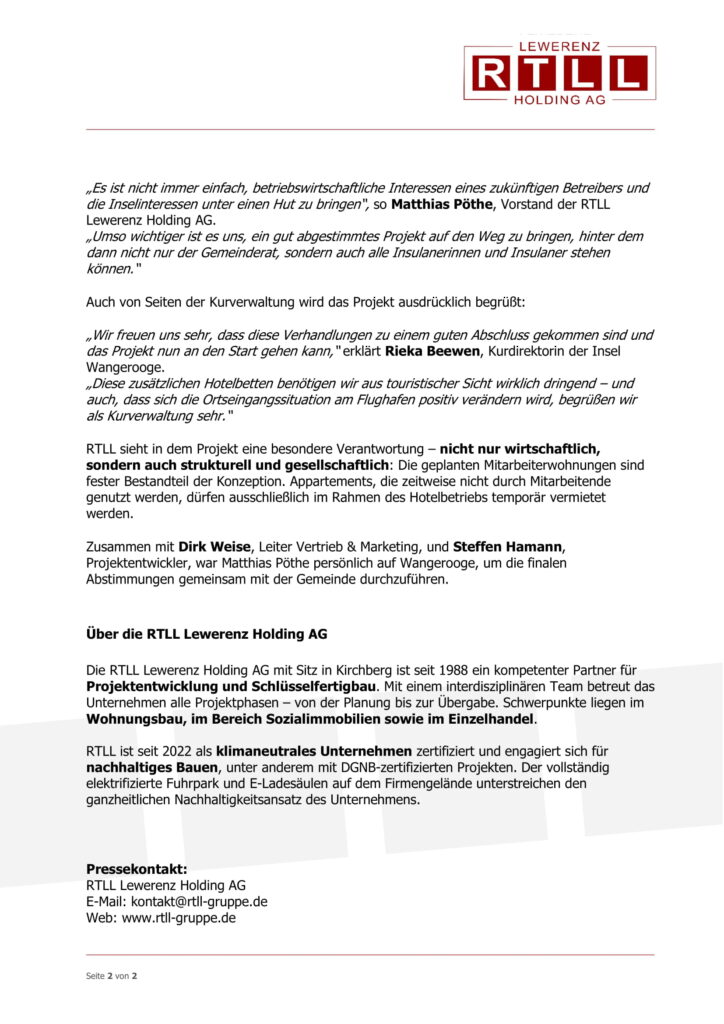 Die Verhandlungen zum städtebaulichen Vertrag und den ersten Vorstellungen gehen bereits auf das Jahr 2019 zurück. Corona, baurechtliche Fragestellungen und einige Unwägbarkeiten haben das Projekt immer wieder ausgebremst. Im Juli 2024 kam es dann zu einem ersten Abschluss eines städtebaulichen Vertrages zwischen der 35. RTLL Objekt GmbH und der Gemeinde Wangerooge. In der Zwischenzeit hat das Unternehmen auch das nebenstehende Grundstück erworben und möchte dieses für die Erweiterung des Hotelneubaus und für die Schaffung von Wohnraum für Angestellte nutzen – im Rahmen einer auf die aktuelle Planung abgestellten neuen Bauvoranfrage kam es dann zur Wiederaufnahme der Verhandlung über einen städtebaulichen Vertrag. „Es ist nicht immer einfach betriebswirtschaftliche Interessen eines zukünftigen Betreibers und die Inselinteressen unter einen Hut zu bringen.“ weiß Matthias Pöthe, Vorstand der RTLL Lewerenz Holding AG. „Umso wichtiger ist es uns ein gut abgestimmtes Projekt auf den Weg zu bringen, hinter dem dann nicht nur der Gemeinderat, sondern auch alle Insulanerinnen und Insulaner stehen können.“