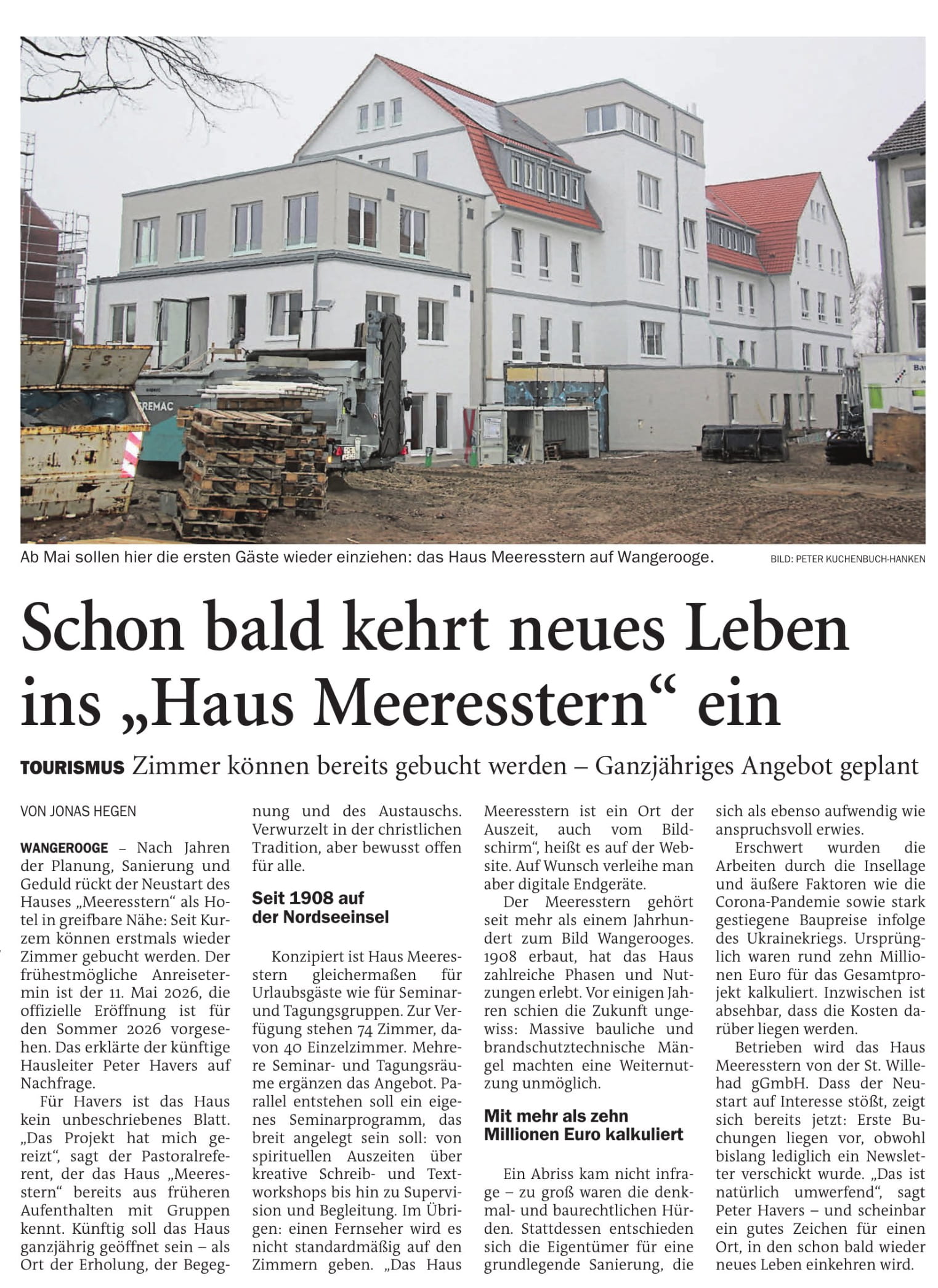 Jeversches Wochenblatt Leute 18.12.2025 Jeversches Wochenblatt – Schon bald kehr neues Leben ins “Haus Meeresstern” ein 17. Dezember 202517. Dezember 2025 peter Post Views: 14