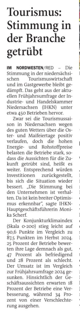 Jeversches Wochenblatt Leute 19.05.2025 Jeversches Wochenblatt – Tourismus: Stimmung in der Branche getrübt 18. Mai 202518. Mai 2025 peter Post Views: 278