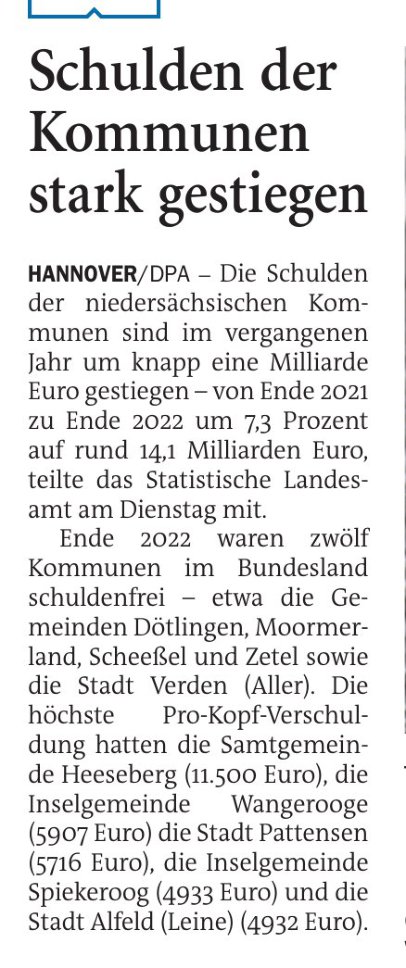 19.07.2023 Schulden der Kommunen stark gestiegen – Wangerooger Prokopfverschuldung bei 5907.- €